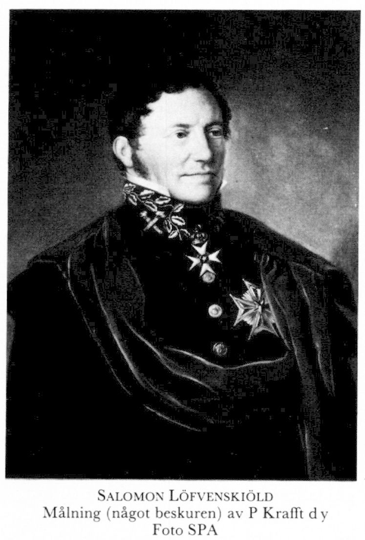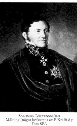1 Löfvenskiöld, Salomon, f 25 dec 1764 på Öströ, Dagsås, Hall, d 25 febr 1850 i Sthlm, Jak. Föräldrar: överkommissarien i amiralitetet Samuel L o frih Johanna Beata Raab. Volontär vid konungens eget värvade reg 1 jan 78, sergeant där 30 sept 78, fänrik vid Kronobergs läns reg 7 febr 79, andre adjutant vid S skånska kavallerireg 3 april 82, förste adjutant 14 nov 88, löjtn där 22 mars 90, stabslöjtn där 19 sept 90, stabsadjutant hos konungen o ryttmästare i armén 12 juli 92, ryttmästare vid nämnda reg:s vargering 14 juni 95, överadjutant hos konungen o major i armén 4 dec 97, hovmarskalk 14 juni 00, deltog i riksdagarna 00, 10 (led av statsutsk), 12 (led av statsutsk), 15 (led av allm besvärs- o ekonomiutsk), 17–18 (led av förstärkta statsutsk), 23, 28–30, 34–35, 40–41, 44–45 o 47–48, tf landsh i Örebro län 26 febr 01, landsh där 16 juni 01, frih 10 sept 10, president i bergskoll 2 april 16, i kammarkoll 15 dec 18–25 juni 30, ordf i komm ang reglering av rikets styrelseverk o i komm ang överseende av de ekon författningarna 2 febr 19, i komm ang magasinsinrättn:s ställn 11 dec 22, led av komm ang myntets o kontrollverkets ställn 17 sept 28. – LPS 07, KorrespLLA 11, HedLLA 28, serafimerriddare 11 maj 25, en av rikets herrar 21 aug 29.