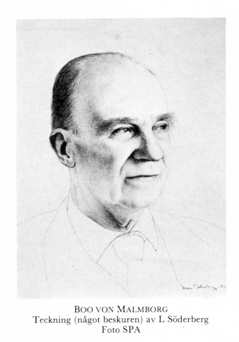 von Malmborg, Boo Fredrik, f 5 dec 1905 i Gävle, d 21 okt 1980 i Sthlm, Matt. Föräldrar: majoren och brandchefen Otto August v M o Ingeborg (Inga) Eva Maria Schough. Studentex vid Palmgrenska skolan i Sthlm 15 maj 25, inskr vid StH ht 25, FK där 15 dec 28, intendent vid kulturhist fören:s museum i Gävle 30–34, anställd vid Gävleborgs läns hembygdsförb 32–33, inskr vid UU 29 mars 34, sekr i komm för inventering av sv privatarkiv 35, FL vid UU 28 maj 36, e befattningshavare vid NM 37, andre intendent där 1 juli 42, eo intendent o förest för sv porträttarkivet 44, sekr i NM:utredn dec 44–juli 49, bitr sekr i statens konstråd 45, sekr där 48–63, led av styr för statstjänstemännens riksförb 47–52, förest för NM:s avd för slottssaml:arna 1 sept 49, ordf i Sv museimannafören:s facksektion 54–56, eo förste intendent vid NM 30 juni 60–71, led av styr för Skoklosters slott 67–72, föreståndare för NM:s arkiv 70–80.