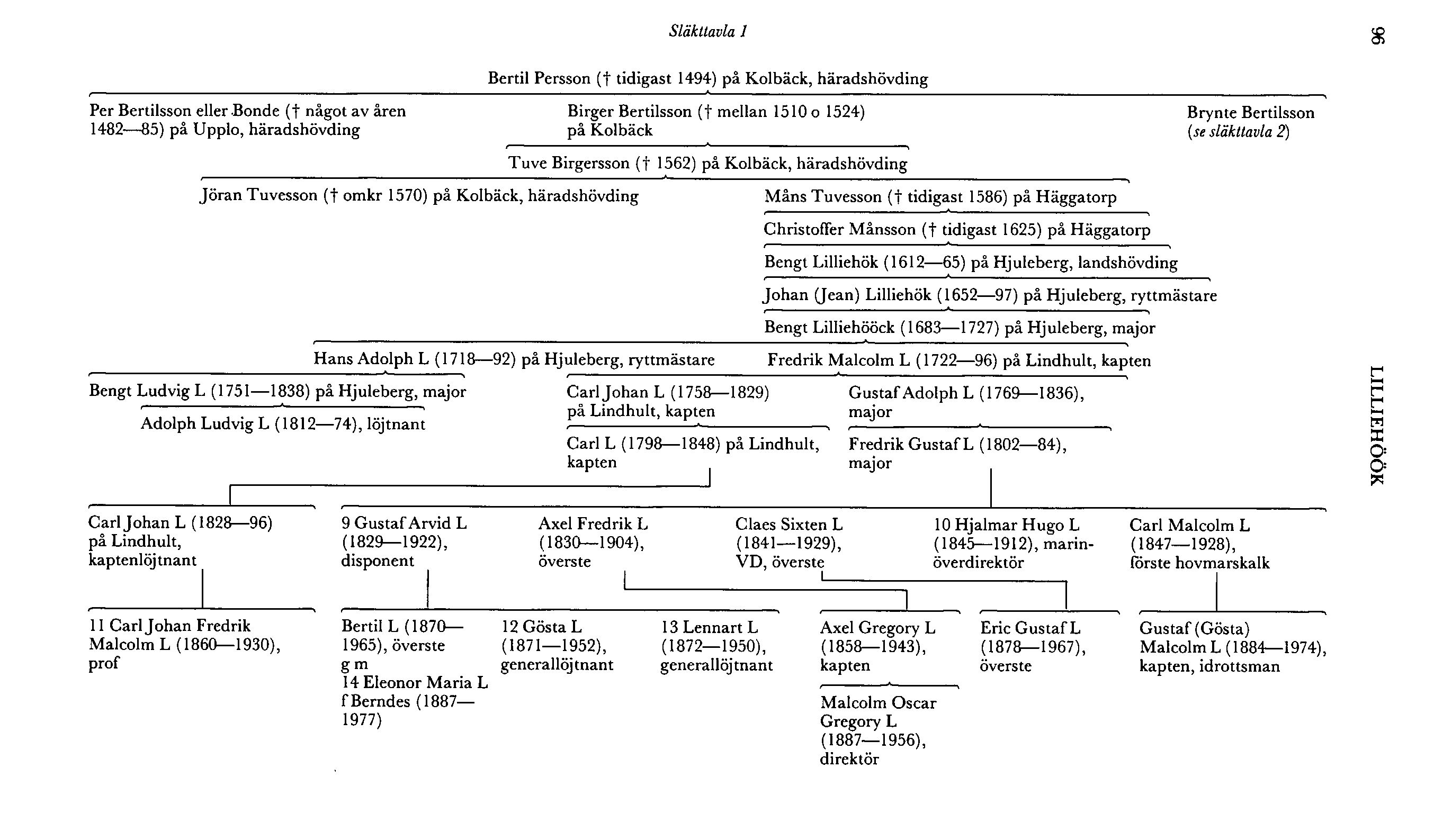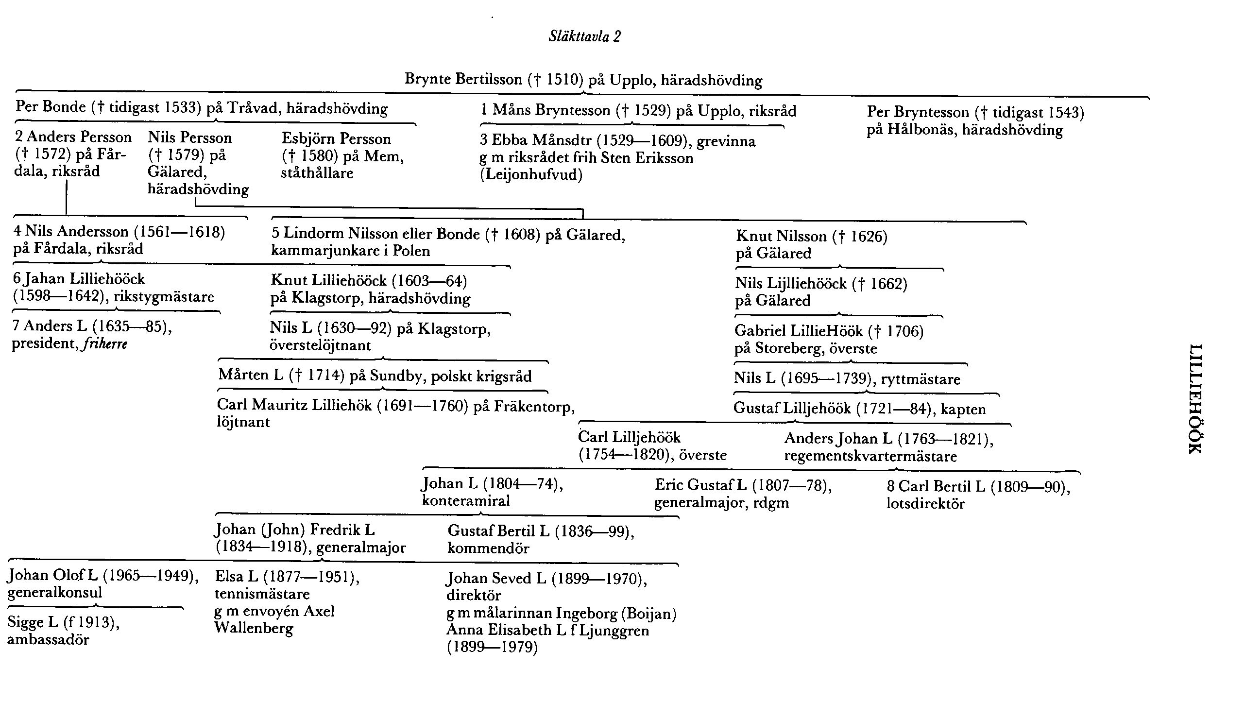 Esbjörns bror riksrådet Anders Persson (L 2) var far till riksrådet Nils Andersson (L 4), vars son rikstygmästaren Johan Lilliehööck (L 6) var far till presidenten Anders L (L 7). Den sistnämnde hade jämte en äldre tidigt stupad bror blivit friherre 1651 men efterlämnade ej några barn. L 6:s bror Knut Lilliehööck (1603—64) på Klagstorp i Norra Kyrketorp, Skar, deltog i Gustav II Adolfs polska krig, blev ryttmästare 1628, gifte sig med hertig Karl Filips (bd 20) änka o var landshövding i Nyland 1642 o i Åbo län 1642—48. Han hade häradshövdingeräntan av Vaksala i Uppland 1625—28 o av Vartofta i Västergötland 1642—53. Hans sonson Mårten L (d 1714) på Sundby i Lilla Malma, Söd, var uppkallad efter sin morfar Mårten Leyonsköldh (bd 22) o har egendomligt nog barontitel såväl i en brevadress (Hanebergsarkivet) som i 1700-talslitteratur (Loenbom). Han blev kapten i holländsk tjänst o 1687 löjtnant i sv tjänst, gjorde sig känd som tillfällighetspoet o blev 1711 assessor i räfstekommissionen i Västergötland o Bohuslän. 1712 fungerade L som Magnus Stenbocks ombud vid dennes underhandlingar med rådet i Sthlm o med konung Stanislaw av Polen då denne vistades vid Medevi brunn, varvid den senare gjorde honom till polskt krigsråd. Under Stenbocks expedition till Tyskland medverkade han vid tillkomsten av det falska brev genom vilket svenskarna fick tillträde till Tönningen. Hemsänd till Sverige med begäran om undsättning deltog L i riksdagen 1713—14, där han spelade en framskjuten roll på riddarhuset bland dem som talade för att Karl XII:s syster Ulrika Eleonora skulle anmodas övertaga styrelsen. Rester av hans arkiv finns i Hanebergsarkivet, vol 10, RA. Hans son löjtnant Carl Mauritz Lilliehök (1691—1760) på Fräkentorp i Lilla Malma föreslog i ett memorial till riksdagen 1740—41 inrättande av en språkvårdande "societet". Memorialet remitterades 1746 till uppfostringskommissionen o anses ha stimulerat den debatt som ledde till SA:s tillkomst 1786. Liksom fadern var han också poet. Flera av hans alster trycktes i de herrnhutiska publikationerna Sions sånger (1748) o Sions nya sånger (1778).