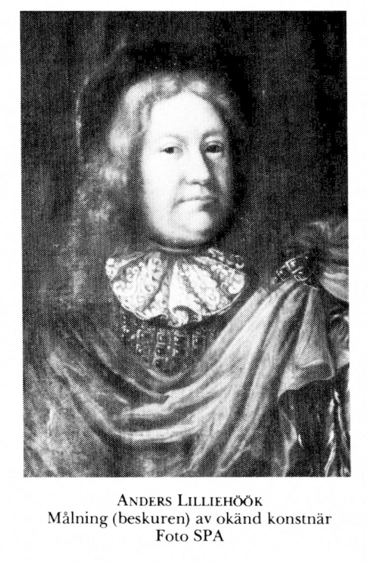 7 Lilliehöök, Anders (skrev sig Lilliehoek), son till L 6 i hans andra g, f 19 dec 1635 i Riga, d 17 nov 1685 i Sthlm. Inskr vid UU 17 juni 43, frih 10 nov 51, deltog i riksdagarna 55, 60, 64, 68, 72, 80, 82/83, kammarherre hos kurfursten av Pfalz juli 57, kammarherre hos Karl X Gustav 57, landsdomare i Skåne o assistensråd vid generalguvernementet där 15 febr 61, president i regeringen i Pommern o hovrätten i Greifswald (tilltr ej) 10 april 63, landsh i Östergötland 5 okt 64, eo envoyé till Polen 9 april 66, återkallad 67, ånyo ambassadör till Polen 18 mars 74, återkom till Sthlm okt 80, president i wismarska tribunalet (tilltr ej) 12 mars 83, led av en komm ang ny kyrkolag 3 jan 83, ensam utredare 8 juli 84.