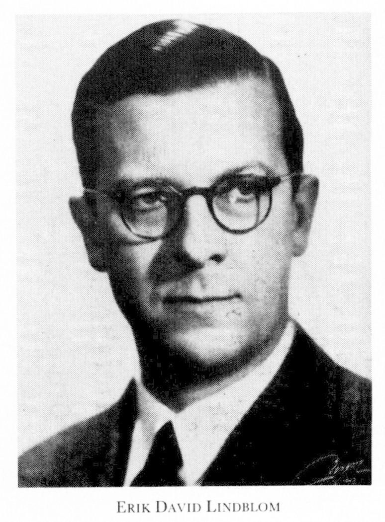 Lindblom, Erik David, f 23 maj 1897 i Luleå, d 28 okt 1977 i Djursholm. Föräldrar: fastighetsägaren Ferdinand L o Regina Josefina Zetterberg. Studentex vid hal i Luleå 25 maj 16, ord elev vid KTH 6 sept 16, avgångs-ex från dess avd för elektroteknik 10 juni 20, ing vid Elektriska prövningsanstalten Holmgren & Rosander i Sthlm 20 — 22, assistent i elektrisk anläggn:teknik vid KTH 22-25, förste assistent vid laboratorierna för elektromaskinlära o elektrisk anläggn:teknik där 25 — 27, ing vid Centralgruppens emissions ab i Sthlm 23 — 25, vid ab Elektrisk malmletning där 24—29, vid ab Elektro-In-vest i Västerås 30—31, vid ASEA:s bergslagsfilial där 31-32, chef för ASEA:s hissavd i Sthlm 32 — 36, dir: assistent vid Sv turbinfa-briks ab Ljungström (STAL) i Finspång, Og, 36, vice VD där 39, VD 41-55, led av styr där 39-58, VD för ab International STAL Co (INSCO) 55-62, konsult vid STAL-LA-VAL 62-67.
