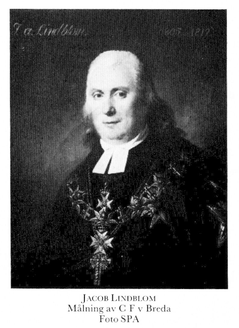 1 Lindblom, Jacob, f 27 juli 1746 på Blackebo, Skeda, Ög, d 15 febr 1819 i Uppsala. . Föräldrar: kontraktsprosten teol dr Axel Johan L o Regina Margareta Paravicino (Bouppt 1717:247, SSA; jfr Örnberg, 7, s 420). Inskr vid UU 4 okt 63, informator i Livland 64-66, mag vid UU 18 juni 70, eo amanuens vid UUB 72, doc i latinsk vältalighet vid UU 3 juni 73, ord amanuens vid UUB 18 okt 73, v bibliotekarie 1 febr 76, eo prof vid UU 12 juni 79, skytteansk prof 7 febr 81, biskop i Linköping 14 dec 86 (tilltr 87), prästv i Sthlm 19 dec 86, riksbanksrevisor 88, deltog i riksdagarna 89—18 (talman i prästeståndet 09—18), revisor i riksgäldskontoret 91, TD 6 juni 93, ärkebiskop o prokansler vid UU 1 mars 05 (tilltr 06), ordf i psalmboks-komm okt 11—jan 19, i uppfostringskomm jan 12—april 17, i komm ang uppläsandet av förordn:ar från predikstolen mars 13—juni 14, i bibelkommissionen 16, i komm ang förbättrad evangeliebok 16—febr 18. — LVVS 74, LVS 84, HedLVHAA 01, LSA 09, serafimerriddare 18.