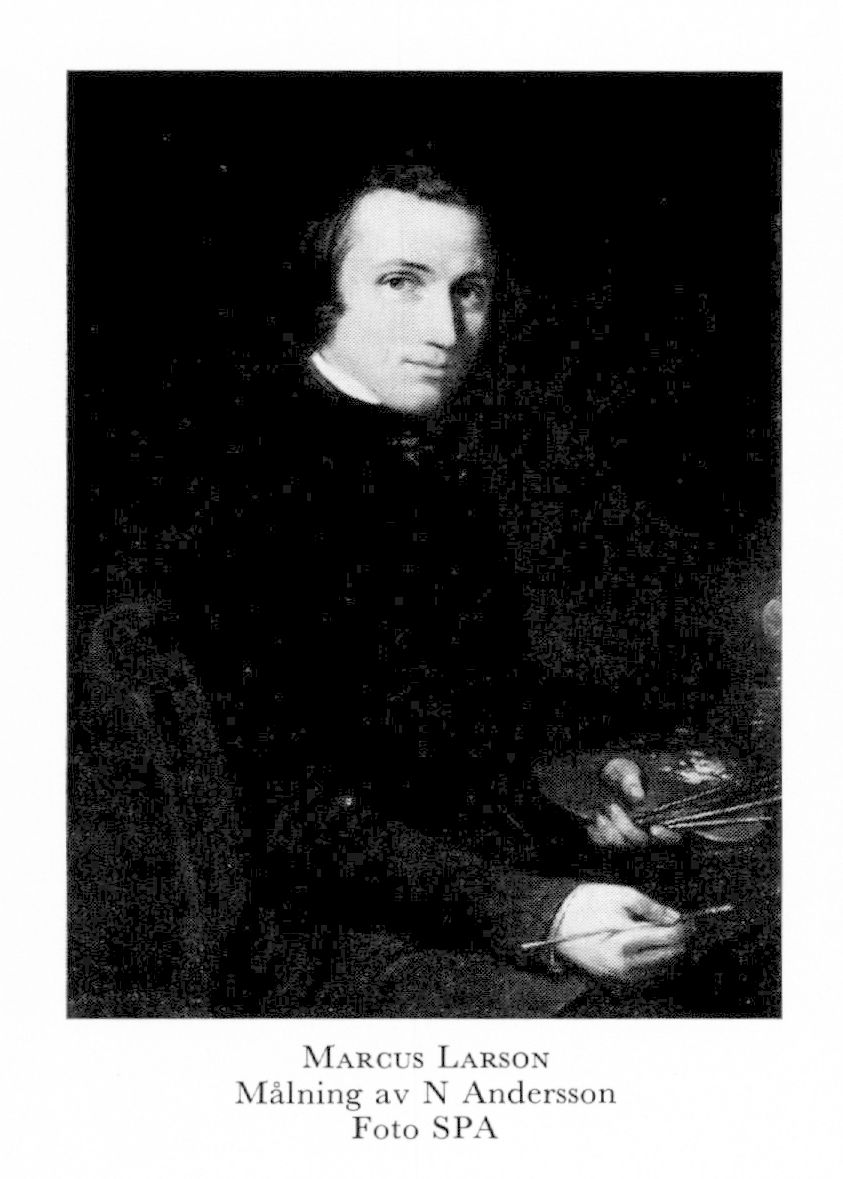 Larson, Simon Marcus, f 5 jan 1825 på Lilla Örsätter, Åtvid, Ög, d 26 jan 1864 i London (enl db för Karlstorp, Jönk). Föräldrar: rusthållaren Arvid L o Eva Sophia Fridman. Elev vid katedralskolan i Linköping vt 35—vt 39, sadelmakarlärling i Sthlm 42, gesäll 46, elev vid FrKAis antikskola 46, modellskola okt 48—49, vik teckndärare i Helsingborg 49, studerade i Düsseldorf 52—55 o 56—57, i Paris 55 o 57, drev målarskola i Flenshult, Karlstorp, Jönk, 58—59, vistades i Finland 60—61, S:t Petersburg 61, London från 62. — Agré vid FrKA 52, LFrKA 57.