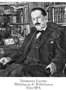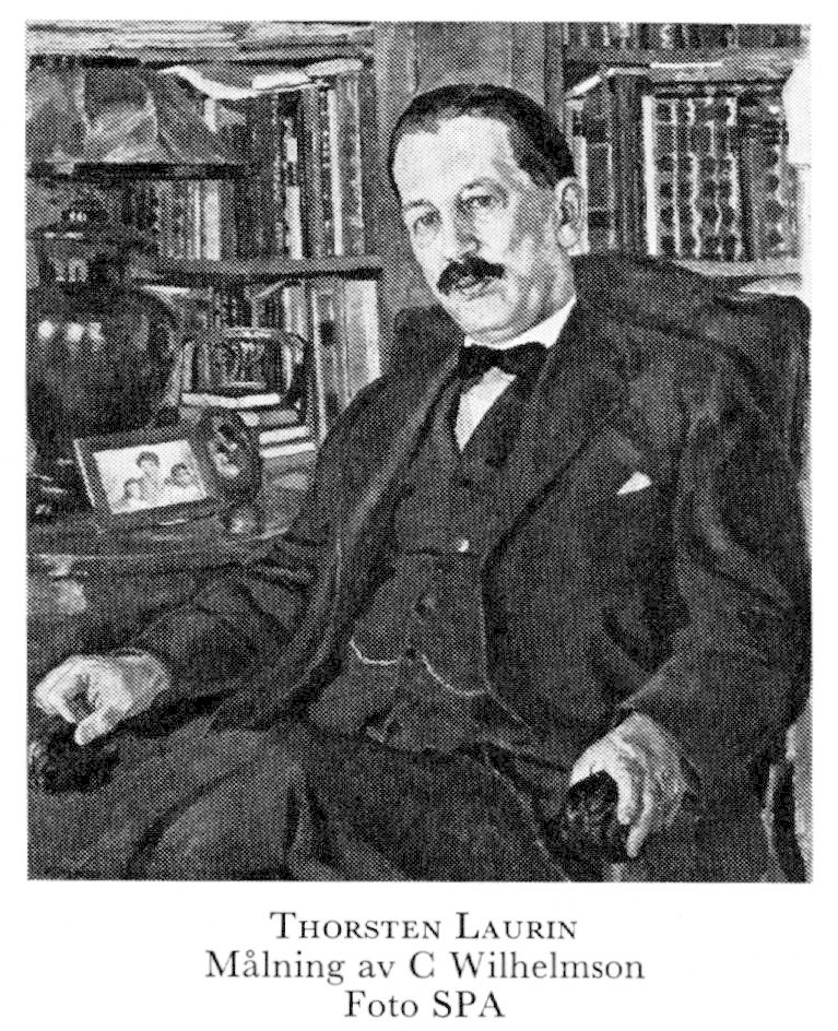 2 Laurin, Thorsten Olof, bror till L 1, f 3 april 1875 i Sthlm, Nik, d 21 jan 1954 där, Osc. Mogenhetsex vid N latinlärov i Sthlm vt 93, inskr vid UU ht 93, jur-fil ex där 30 april 94, JK där 14 sept 00, anställd vid ab P A Norstedt & Söner 04, suppleantdir där 10—24, dir o led av styr samt chef för förlagsavd där från 24, led av styr för SAK 08, initiativtagare till bildandet av fören Nationalmusei vänner 11, sekr o led av styr där från 11, ordf i Fören för grafisk konst 14— 49, led av styr för Liljevalchs konsthall 20—46, för Zornsamlingarna 43. — HedLFrKA 27, Iqml 12:e storl 36, NM:s Apollomedalj postumt 61.