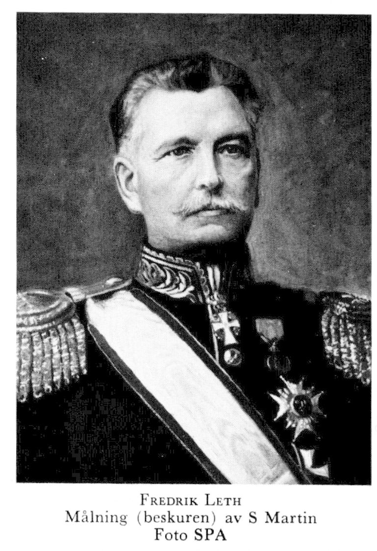 Leth, Fredrik Johan, f 2 mars 1850 i Kristianstad, d 9 jan 1919 i Sthlm, Svea art. Föräldrar: hovrättssekr Axel Olof Georg L o Johanna Frederique af Klercker. Studentex vid h a l i Kristianstad 11 juni 67, officersex vid krigsskolan på Karlberg 15 dec 68, styckjunkare vid Wendes art:reg 21 dec 68, underlöjtn i reg 27 aug 69, vid reg 2 dec 70, elev vid krigshögsk på Marieberg 14 juli 72—23 april 75, repetitör där 28 aug 74—29 okt 77, löjtn vid Wendes art.reg 21 maj 75, andre lär i vapenlära vid krigsskolan 7 febr 77—1 jan 78, sekr i art:staben 2 maj 79—30 sept 84, art stabsofficer 2 maj 79—17 april 89, extra lär i vapenlära vid krigshögskolan 1 april 84—1 april 90, kapten av 2 kl vid Wendes art:reg 12 sept 84, av 1 kl vid generalstaben 20 nov 91, överadjutant o major där 10 mars 92, stabschef vid sjätte fördeln 15 april 92—11 aug 93, led av komm ang fästn:art:kåren i Karlskrona okt—dec 92, major vid Andra Göta art:reg 11 aug 93, chef för fältart:s skjutskola på Marma maj—juli 94 o 95, överstelöjtn vid Wendes art:reg 10 juli 94, chef för femte ridande divisionen A 3 30 juli 94—28 juli 95, överste o chef för Wendes art:reg 29 juli 95, led av fältartilleriexercisreglementskomm sept 95—jan 96, ordf i artillerikomm jan—maj 00, i komm ang försök med ny fältart materiel sept 00, generalmajor, generalfälttygmästare o inspektör för art 30 okt 03—10 april 15, led av komm ang försvaret av Bodens fästn maj—dec 05, av 1907 års generalkommission sept 07—juni 08, militär led av HD 22 jan 09—17 juni 15, insp för militärlärov 20 jan 10—1 jan 17, generallöjtn 30 sept 10, ordf i dir för arméns pensionskassa 9 dec 12—10 nov 18. — LKrVA 89.