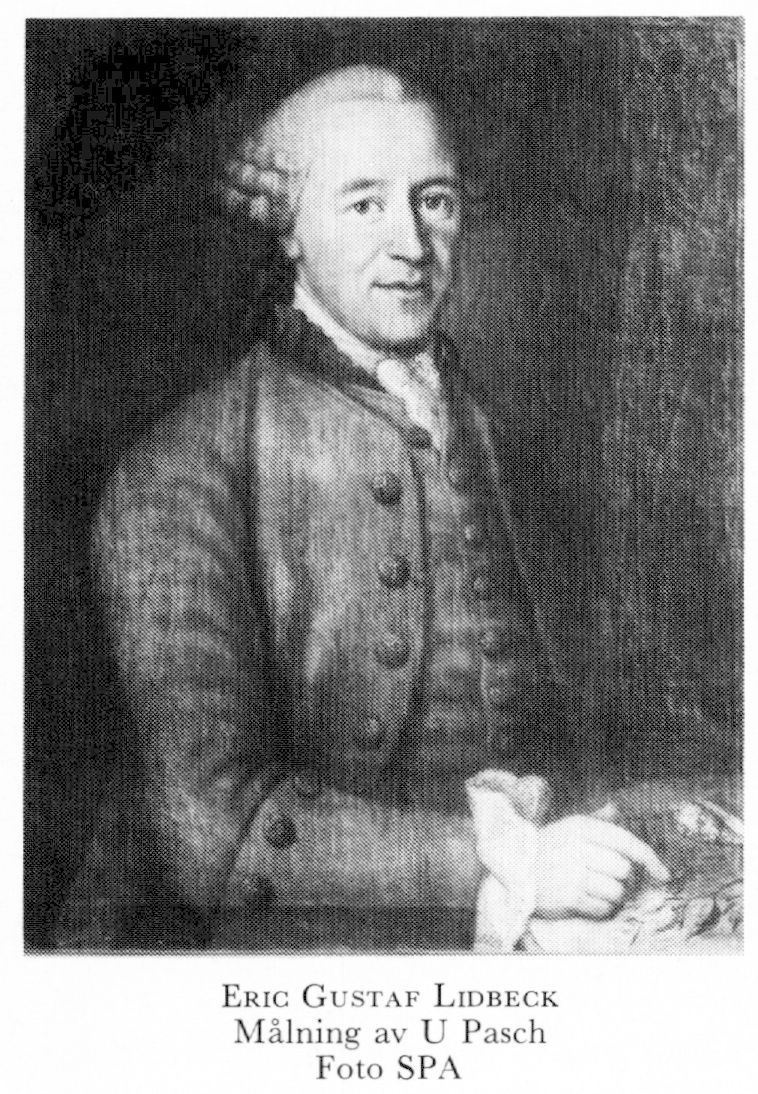 1 Lidbeck, Eric Gustaf, f 21 juni 1724 på Bräcke, Edsleskog, Älvsb, d 9 febr 1803 i Lund. Föräldrar: kronofogden Håkan L o Catharina Hahl. Elev vid Karlstads skola o gymnasium, inskr vid UU 22 febr 42, teol ex där 17 maj 45, ekon ex där 4 nov 45, deltog i Linnés resa till Västergötland 46, auskultant i kommerskoll 10 nov 47, disp pro gradu vid UU 10 okt 47, doc i ekonomi o naturalhist där 48, mag där 13 juni 49, med adjunkt vid LU 10 april 50, præfectus horti botanici där 21 juni 52, prof i naturalhist där o direktör över plantagerna i Skåne 31 mars 56—12 nov 95. — LVA 55, LVVS 76.