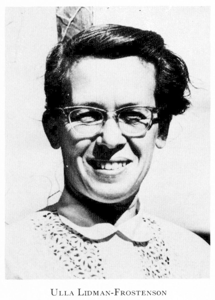 2 Lidman-Frostenson, Ulla Ebba Catharina, dtr till L 1 i hans första g, f 20 nov 1910 i Sthlm, Osc, d 10 juli 1962 i Lovö, Sth. Normalskolekompetens från Ateneum för flickor i Sthlm 28, elev vid Bar-Locks handelsinst 28—29, kontorist hos Bonniers bokförlag 29—32, missionär o lärare i Kina o Mongoliet 32—36 o 38—40, led av AK från 57. — Förf.