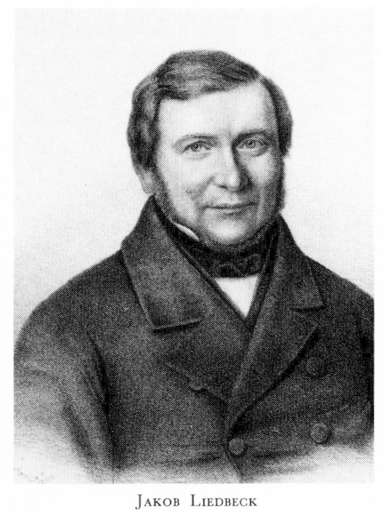 1 Liedbeck, Pehr Jakob, f 16 juni 1802 i Trosa, d 5 okt 1876 i Sthlm, Klara. Föräldrar: handl Per L o Katarina Marschell. Elev vid lärov i Strängnäs, inskr vid UU 5 april 21, med fil ex där 17 dec 23, MK vid UU 15 dec 26, disp där 1 dec 27, ML där 27 febr 28, kir mag i Sthlm 11 dec 28, bitr lär vid Kl läsåret 29—30, vid GCI ht 29— vt 31, erhöll rätt att söka akad lärarbefattn:ar 19 juni 30, tf provinsialläk i Var-berg 11 april—hösten 31, anatomie prosektor vid UU 20 maj 31—46, kirurg vid Nosocomium acad i Uppsala 31—46, MD vid UU 15 juni 35, tf lär i anatomi vid GCI 46—hösten 51.