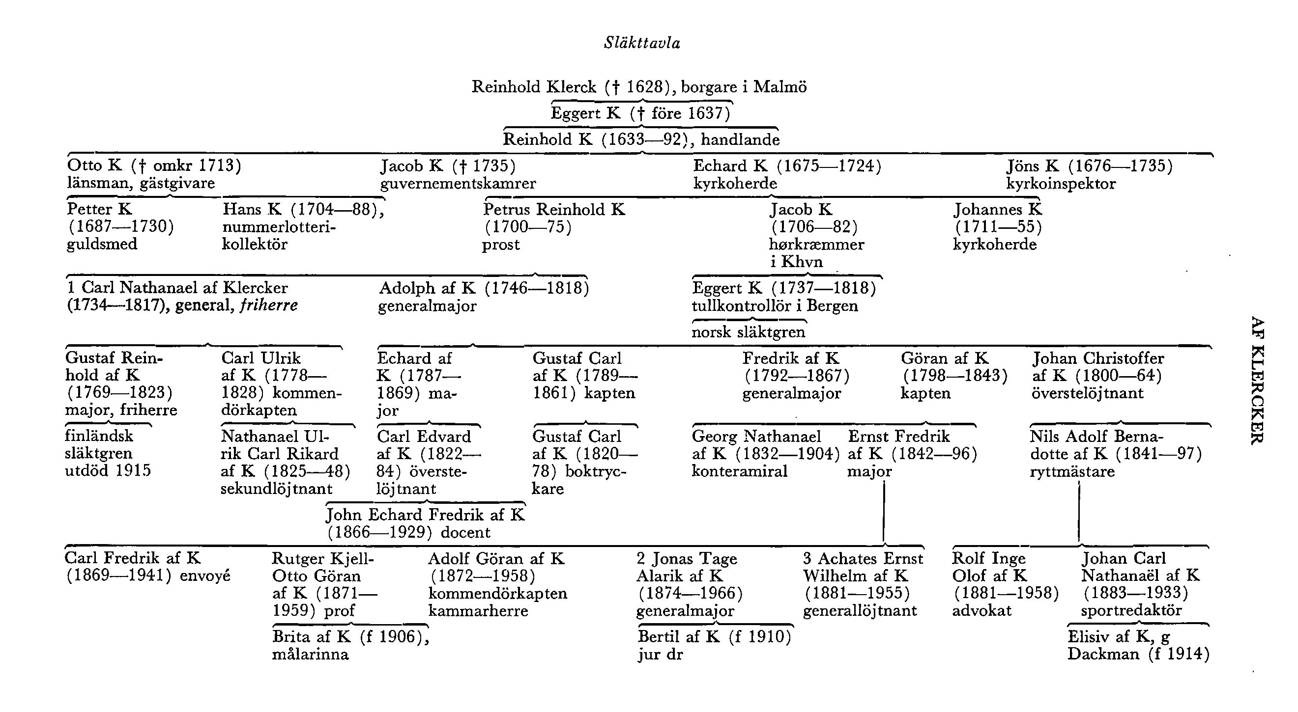 Jacob o Johannes K:s äldste bror, prosten Petrus Reinhold K (1700—75) i Kågeröd, Malm, var far till sedermera generalen Carl Nathanael K, som 1780 adlades med namnet af K (K 1) o 1809 blev friherre enligt RF § 37. Han var morfar till generalfälttygmästaren Carl Henrik Hägerflycht (bd 19) o far till Carl Ulrik af K (1778—1828). Denne deltog i finska kriget 1808—09 o kriget mot Norge 1814 samt blev överstelöjtnant vid arméns flotta 1823 o kommendörkapten 1824. Han hopbragte genealogiska samlingar, som efter hans död ägdes av kamrer Carl Matton o av denne kompletterades samt numera finns i KB (Klercker-Mattonska saml) liksom andra handlingar ur hans arkiv. Avskr av en annan rest av hans arkiv finns i KrA (vissa av dessa brev tr i H E Charlottas dagbok, 8, 1939). Hans gren av släkten utdog med hans son 1848, o hans till Finland överflyttade brors gren utdog på manssidan 1868 o på kvinnolinjen 1915.