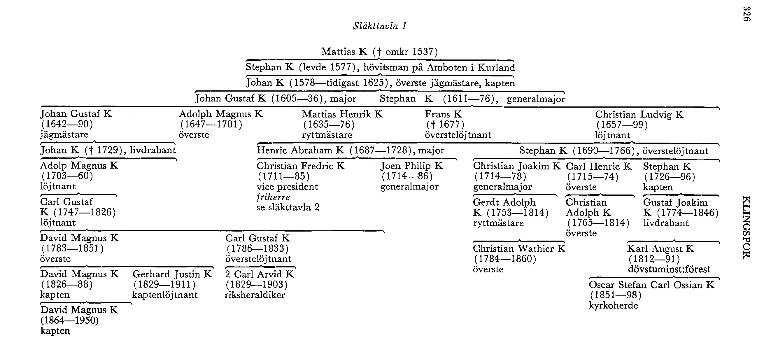 Mattias K (d omkr 1537), som 1507 fick gods i Uexkülls sn i Livland av ärkebiskopen i Riga, var far (likpred, tr av C A Klingspor 1876) till Stephan K. Denne var 1566 hövitsman på biskopsslottet Amboten (Embute) i västra Kurland enligt ett brev (J 30) från den danske kungasonen o biskopen av Kurland Magnus, som 1570 (Wieser) använde honom som sändebud till Reval, då detta genom Clas Kursells bekanta kupp (jfr bd 11, s 493) erövrats från svenskarna. Ännu 1620—22 (RR) var en fordran, som K hade hos Magnus, obetald enligt krav hos den danske konungen från K:s son Johan K (1578—tidigast 1625). Den senare sålde 1600 de ovannämnda godsen i Uexkülls sn, vilka då kallades Klingsporshof men senare efter andra ägare Bandemershof o Präbstingshof. Han nämnes i en odaterad förteckning från omkr 1602 över livländsk adel på sv sida (Bienemann), förekommer i räntekammarböckerna fr o m 1604 som hovjunkare o jägmästare samt blev senare överste jägmästare hos hertig Johan av Östergötland o kapten vid Herman Wrangels småländska infanteriregemente; uppgiften (X 16; SBL, Ny följd), att han skulle ha kommit till Sverige redan 1563 som page hos Katarina Jagellonica, har ej kunnat verifieras o är kronologiskt orimlig. En 1800-talskopia av ett porträtt av K med uppgift om födelseår finns i serien av porträtt på Skokloster av Herman Wrangels krigskamrater. I Sverige fick han som donation av hertig Johan bl a Bällsta i Vallentuna, Sth, som han gjorde till säteri, o som under ett par generationer ärvdes av ättlingar till honom.