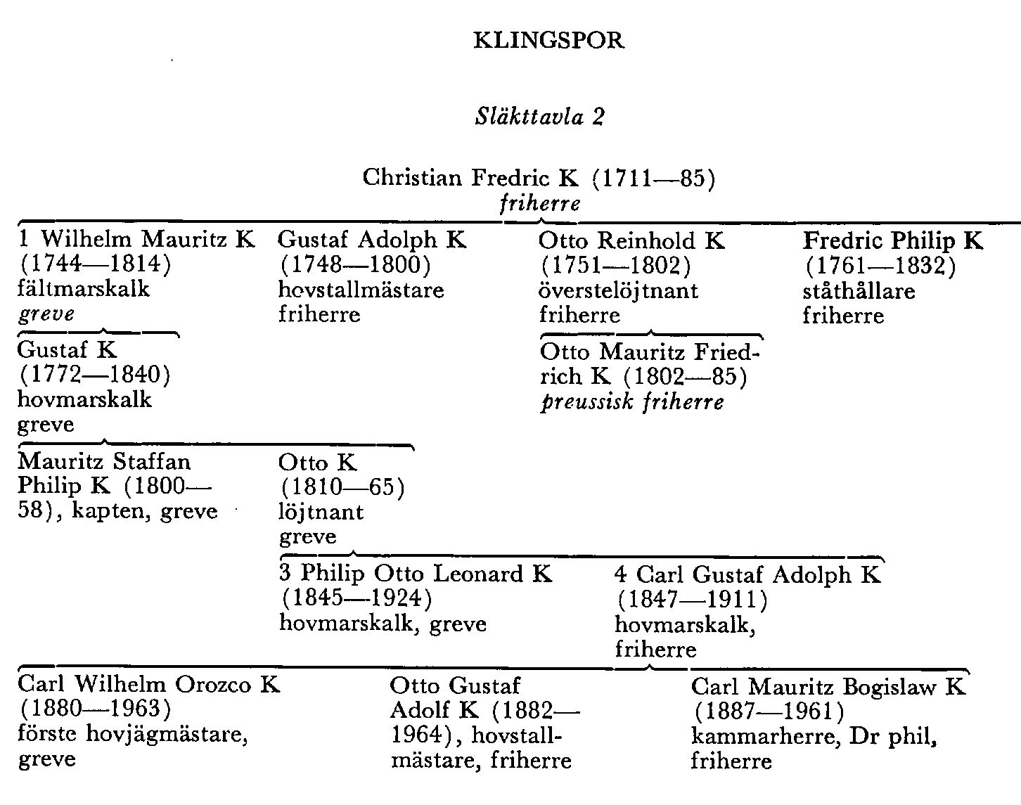 Otto R o Fredric Philip K:s förutnämnde äldste bror, sedermera fältmarskalken Wilhelm Mauritz K (K 1), blev greve 1799 med förbehållet, att titeln skulle endast gälla huvudmannen o hans manliga ättlingar enligt primogenitur. Hans äldste son i första äktenskapet — med en dotter till miljonären Herman Petersen — överstelöjtnanten o hovmarskalken Gustaf K (1772—1840) blev sårad i striden vid Kakkis 1790 o tillfångatagen vid Viborgska gatloppet s å. Han fick i enlighet med sin farbror hovstallmästaren Gustaf Adolph K:s (1748—1800) testamente efter dennes änkas död 1823 fideikommisset Grönlund i Åsbo, Ög, som sedan dess ägts av ättlingar till honom. Hans son kapten Mauritz Staffan Philip K (1800—58) blev känd som oppositionsman, särskilt på riksdagarna 1834—35 o 1840—41. Vid den förra fick Mauritz K varning av lantmarskalken för ett hetsigt uttalande, att regeringen med otillåtna medel sökt genomdriva ett lån, o bortkommenderades från Sthlm för adjutantstjänstgöring på Karlstens fästning. Han tog 1841 avsked från sin tjänst o blev vid sin svagsinte äldre brors död 1848 greve o fideikommissarie samt publicerade i Östgötha Correspondenten ofta vanligen anonyma politiska artiklar, särskilt mot Henning Hamilton (bd 18). En yngre bror till honom var i äktenskap med en dotter till Mathilda Gyllenhaal (bd 17) i hennes äktenskap med överste Josias Montgomery-Cederhielm far till hovmarskalkarna o rdgm:nen Philip Otto Leonard K (K 3) o Carl Gustaf Adolph K (K 4). Söner till K 4 var förste hovjägmästaren Carl Wilhelm Orozco K (1880—1963) på Hellekis i Medelplana, Skar, som var ordförande eller styrelseledamot i flera stora industriföretag o blev greve vid en kusins död 1959, hovstallmästaren Otto Gustaf Adolf K (1882—1964) på Stora Sundby i Öja, Söd, o kammarherren Dr phil Carl Mauritz Bogislaw K (1887—1961) på Öströö i Dagsås, Hall, som skrev Grunddragen av Sveriges äldsta bebyggelsehistoria i geografisk-arkeologisk belysning (1937) o 1961 för arkeologisk forskning donerade 100 000 kr till VHAA.