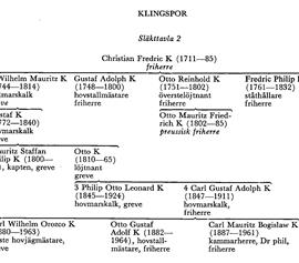 A Ahnfelt, M J Grusenstolpe, 1 (1880), s 86—105; G A Aldén, Bakom riksdagens kulisser. G W Liljecronas dagbok under riksdagen 1840—41 (1917); J A Almquist, Riksdagen i Gefle 1792 (1895); B Beckman, Dalupproret 1743 (1930); dens, De danska mut-räkenskaperna för år 1743 (HT 1944), s 265; B v Beskow, Om Gustaf den tredje såsom konung o menniska (SAH 42, 1867), s 136 ff, 141, 143 f; F Bienemann, Zur Geschichte der livländischen Ritter- und Landschaft 1600—¦ 02 (Mittheilungen aus dem Gebiete der Geschichte Liv-, Est- und Kurlands, 17, 1900), s 595; E L Birck, Fredrikshovsprotokollen som hist källa (FHT 1939), s 68, 75, 111; C A G Braunerhjelm, K lifregits till häst hist, 5: 1 (1917); S E Bring, Drabanten o kaptenen vid lifgardet Olof Stiernhööks journal 1700—03 (KFÅ 1912), s 383; H v Bruiningk, Livländi- sche Giiterurkunden, 2 (1922—23); A Bruse-witz, Studier öfver 1809 års författningskris (Skr utg af HVU, 18:5, 1917), s 92; Car-lander; dens, Miniatyrmålare i Sverige (1897); J L Carlbom, Karl X Gustav (1910); G Carlquist, Rutger v Aschebergs dagbok (KFÅ 1918), s 37; dens, Herman Campen-hausens dagbok 1641—53 (PHT 1923); S Carlsson, Gustaf IV Adolfs fall (1944); dens, Ståndssamhälle o ståndspersoner 1700—1865 (1949); H E Charlottas dagbok, 2—6, 8 (1903—39); M J Crusenstolpe, Medaljonger o statyetter (1882); J A Ehrenströms efter-lemnade hist ant:ar, 1 (1882), s 159, 337; S Eriksson, Sv diplomati o tidningspress under Krimkriget (1939); J R Danielson Kalmari, Finland under gustavianska tiden, 2 (1925), s 151, 154, 159, 164, 188, 212, 216, 292, 295, 377; Ä Davidsson, Sv handteckn:ar (1958); D M Klingspor. In memoriam (Urshults krönika 1951); Th Filén, Om Tranås o Säbybygden (1921), s 206, 282; Friherre Gustaf A K 16 sept 1962 (1962); Frälseg 1: 1—3: 2 (1931— 47), 4 (korr, RA); Förste hovjägmästaren frih Wilhelm K. Minnesskr till sjuttioårsdagen (1950); Genealogisches Handbuch der balti-schen Ritterschaften. Livland, 2 (1936—43), s 990; A Grade, Ur Michael Gustaf Anckar-svärds ppr. Interiörer från riksdagarna 1823, 1828—30 o 1834—35 (PHT 1917); J Göransson, Aftonbladet som polit tidn 1830—35 (1937); E Hederstierna, Sällskapets hedersledamöter o ledamöter af förvaltningsutskottet åren 1814—1914 (Kronobergs läns hushållnings-sällskap 1814—1914, 1914), s 338; I Henschen o A Tuulse, Kyrkor i Vallentuna hd (Sveriges kyrkor. Uppland, 5, 1953—67); [B Hermansson,] Nära ett halvt sekel i Pomo-nas tjänst, av Manson (SvD 5 dec 1944); R F Hochschilds memoarer, 1 (1908), s 146, 167, 198, 2 (1909), s 137 f, 140, 149, 206; M Hofrén, Herrgårdar o boställen. En översikt över byggnadskultur o heminredning å Kalmar läns herrgårdar 1650—1850 (NordMH, 6, 1937); L L v Horn, Biogr ant:ar ...,3:2 (1934); H S, Industriman, jordbrukare, jaktvårdare [Wilhelm K] (NDA 3 okt 1940); dens, Wilhelm K död (SvD 9 jan 1963); I Hult, Karlskrona grenadjärreg:s hist, 2. Smålands ryttare 1629—1709 (1914), s 18, 20, 22—25, 34, 36, 38, 40; G Hulthander, Biogr ant:ar från Garlberg 1792—1892 (1892); G Hyltén-Cavallius, K Kronobergs reg:s officerskår ... 1623—1896 (1897); Härnösands hm; G Jacobson, En tidningsfejd kring Henning Hamilton (HT 1931), s 467 ff; Jagello-nicas page firas av 400-årig ätt (DN 2 maj 1963); Leonhard Kaggs dagbok 1698—1722 (HH 24, 1912); Karl August K (Korsblomman 1893); S T Kjellberg, Halland (Slott o herresäten i Sverige, 1968), s 223, 228; KKD 2—3, 7, 9 (1903—13); C A Klingspor, Sveriges adel under 1600—1700-talen, 1 (1876); dens, Om Belista äldre egare (1881); dens, Extractus der Ao 1599 im Yxkulschen District gehaltenen Revision (Jahrbuch fiir Genealo-gie, Heraldik und Sphragistik 1895, s 191 f); G A Klingspor, Hur K:arna kommo till Sverige (1946); [dens,] Hovmarskalken frih Carl K den 18 nov 1847—1947 (1948), s 10; S L Klingspor, Släktreliker o anekdoter upptecknade åt mina tre söner (1921), s 21 f, 43; E H Kneschke, Neues allgemeines Deutsches Adels-Lexicon, 5 (1864); A Kugelberg, Biogr ant:ar om officerare med vederlikar 1619—¦ 1927 (K första livgrenadjärreg:ts hist, 5, 1930); dens, Gamla linköpingsgårdar, [1—]2 (1943—49); K G Leinberg, Landshöfdingar i Finland 1635—1809, från hvilka skrifvelser till K M:t förvaras i Sv RA (HArk 16, 1900), s 26; B Lesch, Kring sv flyktingskolonien i Hamburgstrakten på 1790-talet (FHT 1932), s 119—22, 125, 129, 135, 137; dens, Jan Anders Jägerhorn (SSLF 288, 1941), s 4, 42, 190, 193—200, 215, 231, 249, 319, 323— 330, 337 f, 375, 497, 513, 522; Lewenhaupt; M Liljegren, Stormaktstidens gravkor (1947); L Luthander, Västergödand (Slott o herresäten i Sverige, 1968), s 156 ff, 160—66, 379, 383 ff, 388; Lärd kammarherre donerar 100 000 kr (SvD 8 mars 1961); Malmström; Å Meyerson mfl, Herman Wrangel o hans krigskamrater. En porträttserie på Skokloster (Livrustkammaren, 12, 1972), s 247, 257, 259, 267; P Morsing, Prästkulla (Herrgårdar i Finland, 1, 1928), s 349; O Nilsson, Danmarks uppträdande i den sv tronföljarefrågan åren 1739—43, 4 (1901—05), bil, s 11; A Nisbeth, Östergötland (Slott o herresäten i Sverige, 1971), s 49; J Nordberg, Konung Carl den XILtes hist, 1—2 (1740); G G Nordin, Dagboksant:ar för åren 1786—92 (HH 6, 1868), s 52, 72, 77 f, 88 ff, 108, 118 f; H Nordqvist, Södra Sveriges fiskerifören (Kronobergs läns hushålln:sällsk 1915—41, 1942), s 205, 207; A Noreen, Ant:ar om K Hallands reg (fd Västgötadals) åren 1625— 1910 (1911); Odhner, 1, s 31 f, 321, 323, 3 s 139 ff, 163, 260; H A Olsson, Ministerstyrelse-o kollegialprinciperna i sv reformdiskussion 1812—40 (1934); H Peyron, G A K in memoriam (SvD 30 maj 1964); A Pihlström o C F Schenström, K Dalreg:ts hist, 3 (1906), s 95 f, 5 (1911), s 65, 143 f, 147, 151, 154, 157, 163, 167, 172, 193—280 passim, 291, 301, 303, 6 (1938), s 68, 107, 444, 459, 508, 591; S Pira, Herrgårdar i Norra Vedbo hd, 2 (1944), s 138—42; W Ridderstad,