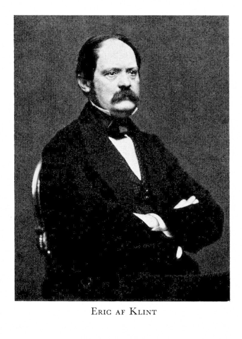 3 af Klint, Eric Magnus, brorson till K 2, f 31 okt 1813 på Östra Boråkra, Nättraby, Blek, d 26 maj 1877 i Sthlm, Skeppsh. Föräldrar: konteramiralen Carl af K o Hedda Susanna Kihlgren. Kadett vid krigsskolan på Karlberg 1 juli 28, utex 19 nov 33, fänrik vid 2:a livgrenadjärreg 14 dec 33, elev vid högre art:lärov å Marieberg 1 okt 35, utex 13 juni 38, led av riddersk o adeln vid riksdagarna 40—66, löjtn i armén 10 mars 40, generalstabsoff 13 april 40, deltog i övningslägren på Ladugårdsgärdet 43, 45, 47, löjtn vid nämnda reg 5 mars 46, adjutant vid livgardesbrigadens stab 27 april 47, adjutant hos kronprins Karl 9 dec 47—7 jan 58, kapten i armén 30 maj 48, tjänstg hos kronprinsen, när denne var chef för den i Malmö förlagda fördelningen av skånska armékåren 48, stabschef vid livgardesbrigaden 4 dec 48, stabschef hos högste befälh vid lägren på Ladugårdsgärdet 49, 51, major i armén 12 juni 50, stabschef vid l:a infanteribrigaden under lägret på Ladugårdsgärdet 50, stabschef hos högste befälh under lägret på Ljungbyhed 52, kapten i reg 25 maj 53, överstelöjtn i armén 7 juli 53, chef för lantförsvarsdep:s kommandoexp 9 juli 53—3 maj 62, led av komm för generalstabens omorganisation 55, major vid reg 8 jan 58, överste i armén 15 juni 58, led av lantförsvarskomm juli 61—maj 65, överstelöjtn vid reg 18 mars 62, överste o chef för reg 27 mars 62, generalmajor i armén 3 maj 64, ordf i komm för utarb av förslag till nytt tjänstgör:reglemente för armén avseende tjänsten i fält 22 nov 64, ordf i stadsfullm i Linköping 66—71, led av FK 67—75 o 77 (led av särsk utsk 67 o 69, av statsutsk 70— 75 o 77), ordf i komm för utarb av förslag till nytt fältförvaltn:reglemente 29 sept 70—12 dec 72, generalbefälh i 1:a militärdistr 14 juli 71, led av komm för granskn av förslag till ny härordn sept 73—april 74, generallöjtn i armén 18 maj 75, ordf i komm för utredande av frågan om Karlsborgs fästn mars—maj 76. — LKrVA 54. — Ogift.