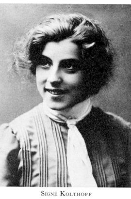 3 Kolthoff, Gertrud Signe Elisabeth, f 17 mars 1881 i Uppsala, d 8 maj 1961 i Sthlm, Hedv El. Föräldrar: dekorationsmålaren Oscar Alfred Bernhard K o Mathilda Christina Johansson. Elev vid flicklärov i Uppsala, vid Musikkonservatoriet i Sthlm sept 97, musiklär:ex där 12 dec 00, sångstudier för Jeanette Jacobsson 01–02, debut på Olympiateatern i Sthlm 25 okt 02, operettengagemang i Sverige o Finland 02–04, talskådespelerska vid Sv teatern i Hfors 04–15, vid Dramatiska teatern i Sthlm 15–33, gästspel bl a vid Vasateatern o Riksteatern samt i Oslo o Khvn. — Litt et art 26.