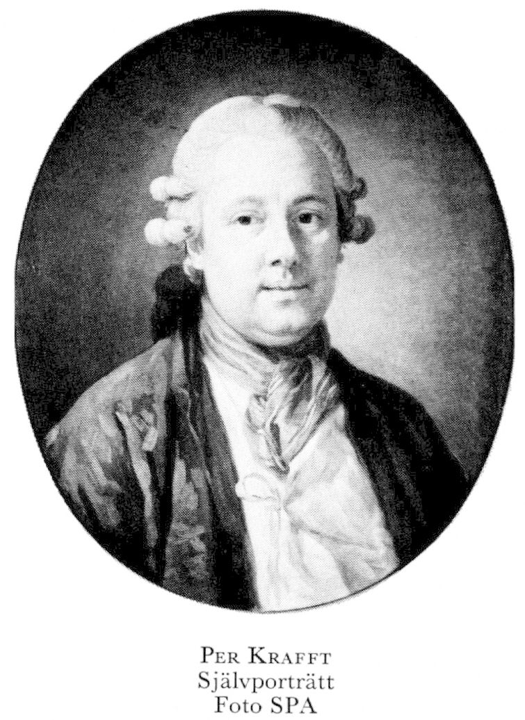1 Krafft, Per, f 16 jan 1724 i Arboga, d 7 nov 1793 i Sthlm, Klara. Föräldrar: handlanden Erik K o Anna Greta Cupp. Inskr vid UU 5 mars 36, elev hos porträttmålaren J H Scheffel i Sthlm 40—43, hos C G Pilo i Khvn 49—55, studier i Paris 55—62, förste hovmålare hos markgreve Fredrik i Bayreuth 17 april 62, prof vid konstakad där 62—64, studieresa till Italien 64—65, åter i Bayreuth 67, hovmålare hos Stanislaus II Poniatowski i Warszawa 20 sept 67—68, verksam i Sthlm från nov 68, erhöll understöd av slottsbyggn: direktionen för arbeten vid Sthlms slott 14 nov 70, prof:s n h o v 25 nov 73. — LFrKA 73.