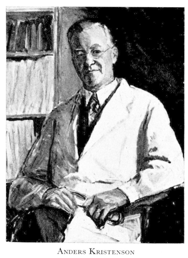 Kristenson, Anders Vilhelm, f 17 nov 1888 i Rönnäng, Göt, d 7 nov 1954 i Sthlm, Engelbr. Föräldrar: folkskollär Anders Johan K o Hilda Sabina (Beria) Lundgren. Mogenhetsex vid Gbgs h latinlärov vt 07, inskr vid UU 15 jan 09, MK där 12 sept 12, fältläkarstipendiat maj 14—nov 17, ML vid Kl 8 sept 17, underläk vid Örebro länslasaretts kir avd 1 nov 17—15 juni 19, bataljonsläk vid Upplands reg 16 maj 19—31 dec 27, bitr lärare i fysikalisk diagnostik i Uppsala 1 juli 20—30 juni 22, 1 sept 27—40 (37—40 tillika laborator), amanuens resp underläk vid med kliniken där 1 sept 22—31 aug 26, disp pro gradu vid UU 10 maj 24, MD 31 maj 24, docent i praktisk med vid UU 3 okt 24—30 april 37, bitr lär i med 1 juli 25—31 aug 27, överläk vid bröstkliniken 1 sept 27— 30 april 37, regementsläk vid Upplands reg 1 jan 28—30 april 37, överläk vid Akad sjukhusets centralsanatorium 1 maj 37 (tf juli 35), prof i med vid Kl o överläk vid Serafimerlasarettets med avd 2 från 1 nov 40, led av styr för Statens inst för folkhälsan 40, medl av med:styr:s vetensk råd från 45, läk vid Sthlms centraldispensär från 45, led av komm för Karol sjukhusets utbyggn från 47.