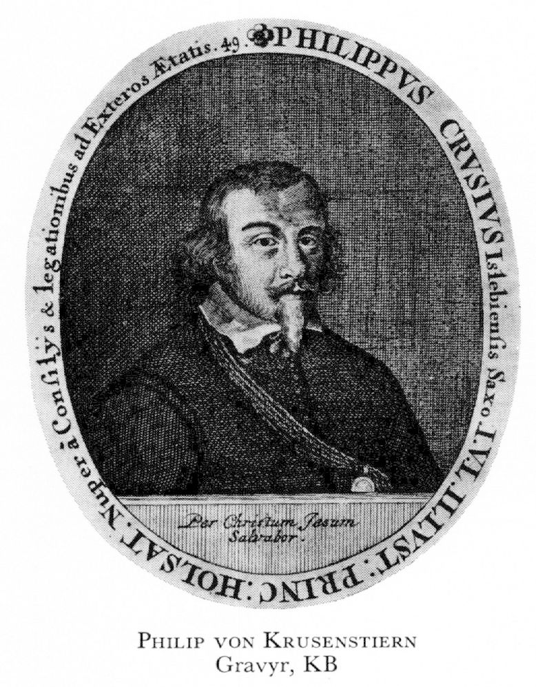 1 von Krusenstiern, Philip (före adl Crusius), f 1 maj 1597 i Eisleben, Tyskland, d 10 april 1676 i Reval. Föräldrar: diakonen magister Johannes Crusius o Barbara Kreijer. Jur utr lic i Tyskland, hovråd hos greven av Mansfeld, legat till Wallenstein i Prag 21, i tjänst hos hertig Fredrik av Holstein-Gottorp 22, hertiglig kommissarie i Nord-Dithmarschen, i kejsar Ferdinand II :s tjänst som krigskommissarie i Wilster, Krempe o angränsande marskländer maj 28—29 o legat till Italien 30, Wallensteins legat till hertig Fredrik av Holstein-Gottorp okt 32, hertigens legat till Axel Oxenstierna i Halle jan 33, till drottning Kristina maj 33, till Ryssland nov 33—april 35, till Ryssland o Persien okt 35—aug 39, holsteinsk resident i Reval 4 juni 40, i sv tjänst 44, vid estniska guvernementet o borgrätten i Reval, ingick i Schwarzenhäuptergillet där 1 nov 44, assessor vid borgrätten där 18 dec 48, adl 9 mars 49, stats- o assistensråd vid estniska guvernementet o assessor vid borgrätten i Reval 5 febr 51, kommissarie vid gränsregleringen mellan Ingermanland o Ryssland 24 mars 52—53, kommerciedir i Estland o Ingermanland 53, dessutom borggreve i Narva 20 aug 53, hovråd juni 55, legationsråd vid Karl X Gustavs beskickn till Moskva 30 juni 55, deltog i stilleståndsförhandl:arna mellan Sverige o Ryssland i Vallisaari 58, ståth i Reval 19 dec 59—5 maj 70.