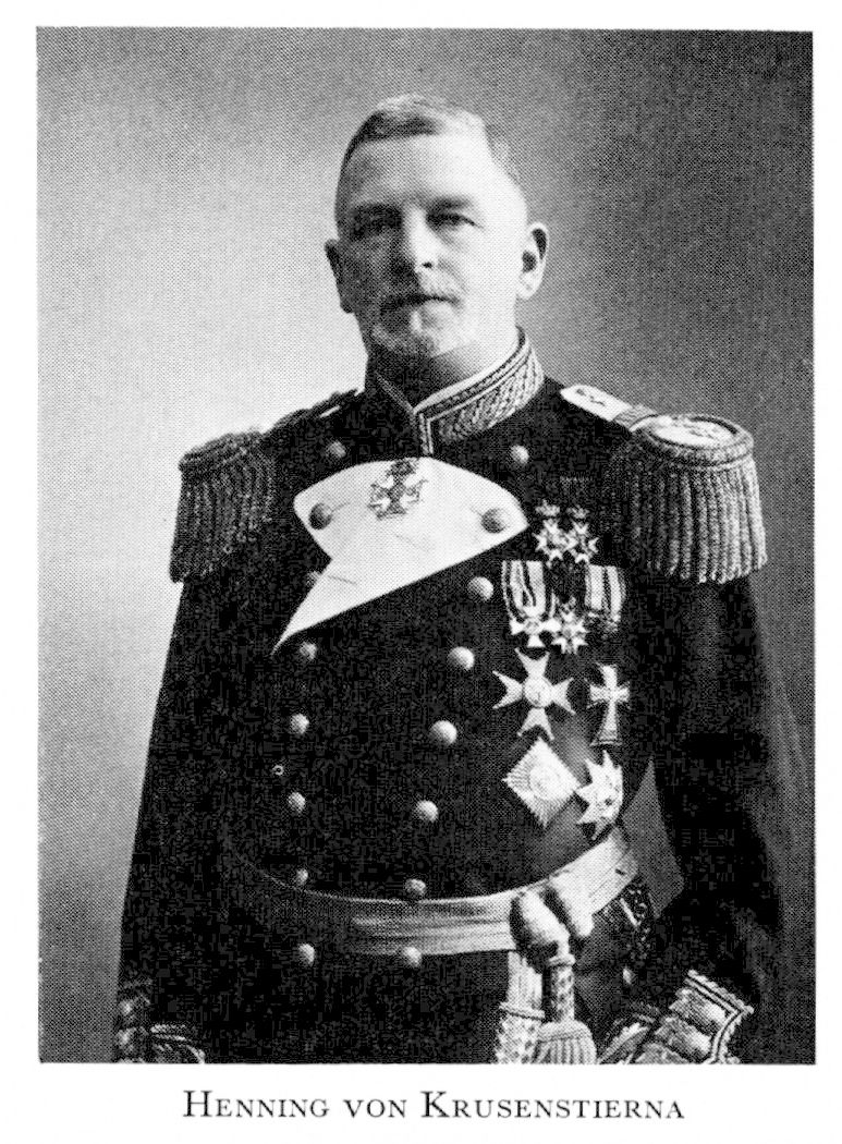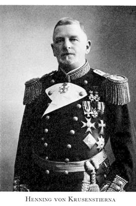 5 von Krusenstierna, Henning Vilhelm Mauritz, f 19 febr 1862 på Nedre Bräcke, Bäve, Göt (nu: Uddevalla), d 30 okt 1933 i Sthlm, Skeppsh. Föräldrar: kaptenen Carl Sebastian v K o Selma Amanda Margareta Berggren. Elev vid sjökrigsskolan 30 sept 76, kadettkorpral 3 okt 81, sjöofficersex 1 okt 82, underlöjtn vid flottan 18 okt 82, deltog i fregatten Vanadis världsomsegling 83—85, utex från instruktörskursen vid GCI 15 april 87, löjtn 29 april 87, anställd i italienska örlogsflottan 90—91, tjänstg vid flottans stab 1 okt 91—30 sept 05, kapten 10 aug 92, lär i militär kustgeografi vid sjökrigshögsk 98—06, kommendörkapten av 2 gr 31 okt 03, militär expert vid Karlstadkonferensen sept 05, avd:chef vid flottans stab 1 okt 05—30 sept 06, led av värnpliktskommissionen jan 06—febr 07, chef för sjöförsvarets kommandoexp 1 okt 06—30 sept 09, kommendörkapten av 1 gr 22 jan 09, stabschef hos inspektören för flottans övn:ar till sjöss 1 okt 09, statsråd o chef för sjöförsvars-dep 10 juni 10—7 okt 11, kommendör vid flottan 1 april 12, sakk ang sjöförsvarets ordnande mars—maj 14, konteramiral i flottan o chef för marinstaben 27 juni 16—23 mars 27, led av komm för arméns o marinens flygväsen juni 17—nov 21, ordf i komm rör tjänsten vid flottans stationer maj 18—sept 19, konteramiral vid flottan 6 dec 18, v amiral 22 juni 23, sakk ang flottans ersättn:byggn juni 25—dec 26, avsked med utnämn till amiral i flottans reserv 1 april 27, led av eko-nomisakk dec 28—okt 30, av krigshovrätten 30—32, avgick ur reserven 19 febr 32. — LÖS 97 (HedLÖS 10), LKrVA 05 (styresman 27—29).— Ogift.