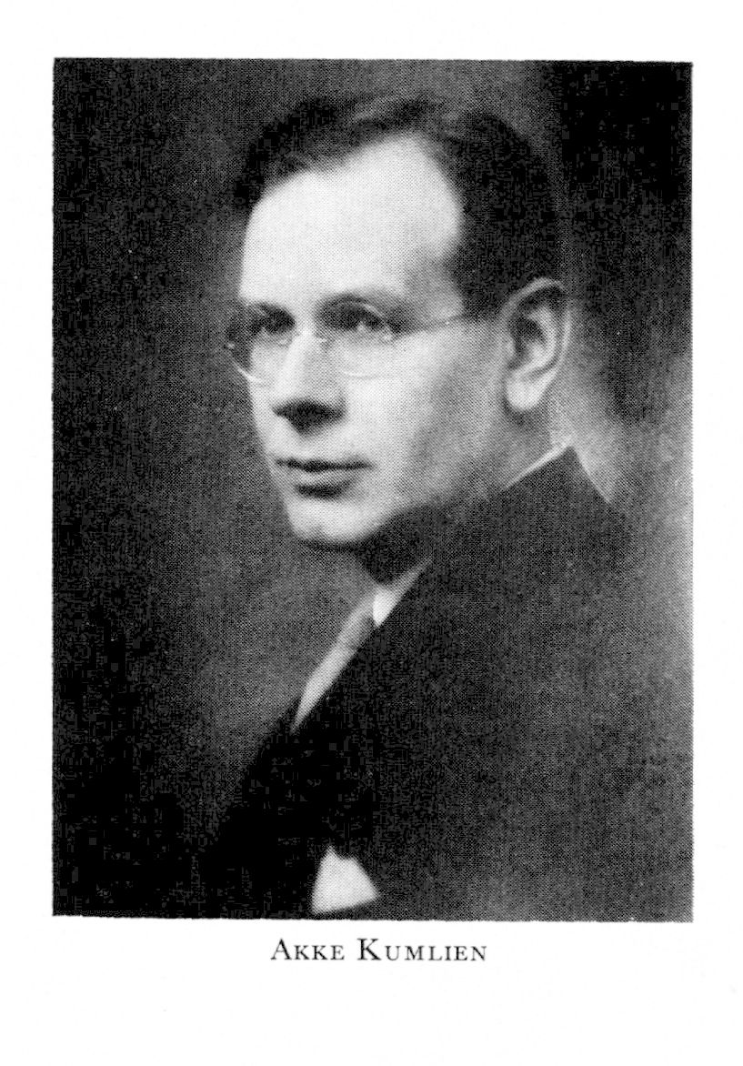 3 Kumlien, Axel (Akke) Ragnar, son till K 1, f 3 april 1884 i Sthlm, Hedv El, d 4 juni 1949 där, Osc. Mogenhetsex vid h reallärov i Sthlm 18 maj 03, inskr vid UU 19 okt 05, FK där 15 dec 10, lär vid Värmlands läns folkhögsk i Molkom ht 11—jan 12, eo amanuens vid LU:s hist mus 8 jan 13—14, inskr vid LU ht 13, FL där 29 jan 14, amanuens vid LU:s konstmus 14—15, vid NM 16—31, konstnärlig rådgivare hos ab P A Norstedt & Söners förlag 16—46, lär i materiallära o måleriteknik vid konsthögsk från ht 24, förest för konsthögsk :s inst för materialkunskap från 28 juni 35, för Skolan för bok- o reklamkonst i Sthlm 41—46, intendent vid Thielska galleriet från 46. — Bokkonstnär, målare, skriftställare. — Fil hedersdr vid StH 30 maj 47.