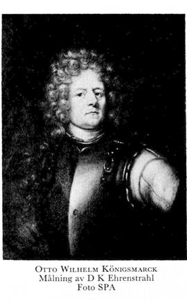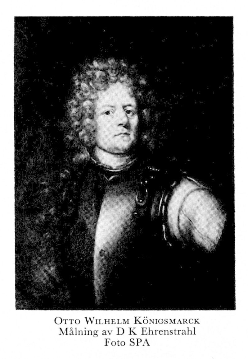 3 Königsmarck, Otto Wilhelm, bror till K 2, f 5 jan 1639 i Minden, Westfalen, d 15 sept 1688 på ett venetianskt amiralsskepp utanför Chalkis (dåv Negroponte), Grekland. Studier vid univ i Leipzig 51—53, i Jena 53— 55, studieresor i Europa 57—60, överkammarherre vid sv hovet 11 dec 60, envoyé till England 17 dec 60, överste o chef för C G Wrangels kavallerireg 64—65, ambassadör till Frankrike april 66 (fullm 31 maj 65), till sachsiska hovet febr 67, major i kurpfalzisk tjänst 67, överste för livgardet till häst 10 aug 67, för Livreg till häst 26 nov 67—23 maj 72, sv ord ambassadör i Frankrike 4 dec 71—74, generalmajor o vice guvernör i Bremen o Verden 23 maj 72, fransk maréchal de camp 74, sv generalfältmarskalklöjtn 21 sept 74, fältmarskalk 13 okt 75, befälhavare över militien i Pommern 27 nov 75, generalguvernör över Pommern, Rügen o Wismar 14 okt 79, kansler för univ i Greifswald 79— 85, generalissimus över venetianska krigsmakten 85.