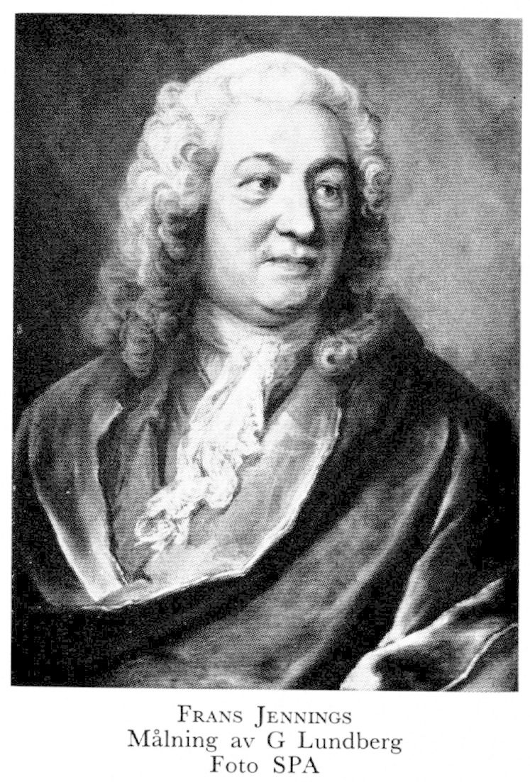 1 Jennings, Frans, f 1692 i Belfast, Irland, d 19 juli 1754 på Skånellaholm, Skånela, Sth. Järnexportör i Sthlm från 1720-talet, naturaliserad sv adelsman 21 juli 42, deltog i riksdagarna 42—43 o 51—52, kommerseråds titel 8 juli 51, bruksägare.