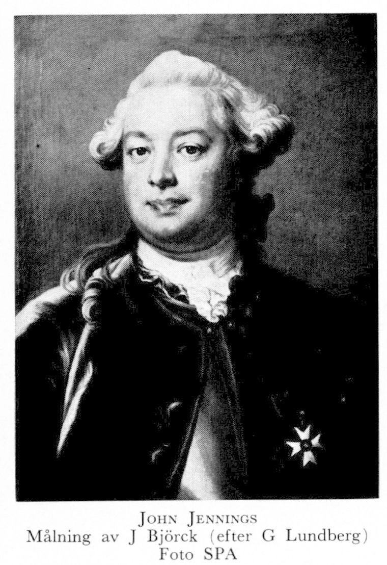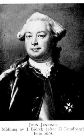 2 Jennings, John, son till J 1, f 14 dec 1729 i Sthlm, d 14 dec 1773 på Forsmarks bruk, Forsmark, Sth. Inskr vid UU 1 april 49, adjutant vid Livreg till häst 12 juni 50, avsked från reg o ryttmästares karaktär 9 okt 53, kompanjon m Robert Finlay under firma Jennings & Finlay 54—20 juli 62, deltog i riksdagarna 55—56, 60—62, 65—66, 69—70 o 71—72, en av dir för Trollhätte slussverk 61—66 o från 70, fullm i Jernkontoret 60—63, kammarherre 67, hovmarskalks titel 7 juni 70. — LVA 56 (preses där 61 o 69).