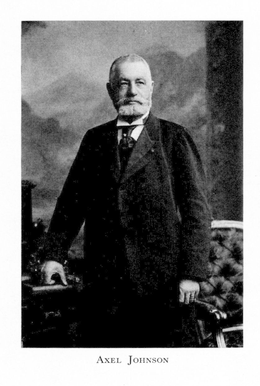 1 Johnson, Axel, f 23 mars 1844 i Jönköping, d 13 maj 1910 i Sthlm, Klara. Föräldrar: sadelmakarmästaren Carl Johan Johnsson o Brita Christina Rålin. I handelsyrket i Sthlm från 62, drev kommissionsaffärer där från 69, egen agentur- o kommissionsaffär där aug 73, från 75 under firma A Johnson & Co, burskap som grosshandl i Sthlm 15 juni 80, en av grundarna av Avesta Jernverks ab 83, konsul för Siam i Sthlm 84, generalkonsul från 92, en av initiativtagarna till Sveriges allm exportfören 87, led av stadsfullm i Sthlm 88—98, grundade Rederiab Nordstjernan 2 maj 90, led av handels- o sjöfartskomm juli 98—dec 00, av styr för Sthlms ensk bank 02—09, en av initiativtagarna till Sthlms handelskammare 02, förvärvade aktiemajoriteten i Avesta Jernverks ab 05, ordf i styr där från 05.