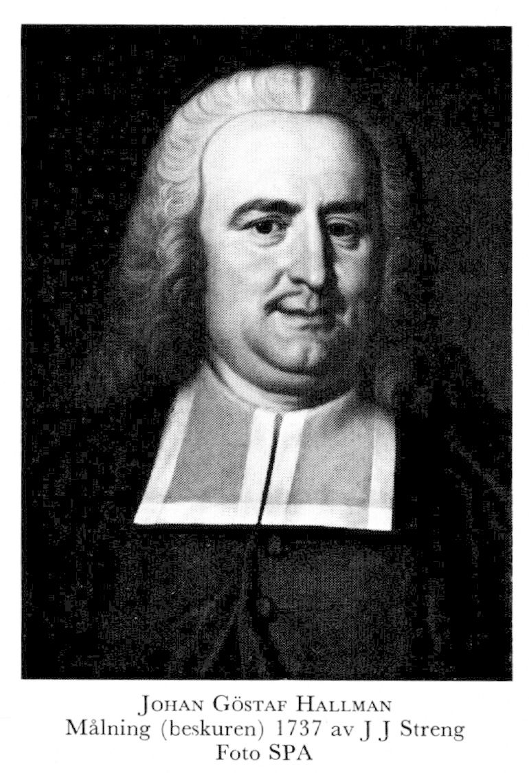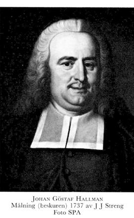 1 Hallman, Johan Göstaf, f 26 juni 1701 i Sköldinge (Söd), d 23 aug 1757 i Sthlm (Hedv El). Föräldrar: kh Gustaf Samuel H o Margareta Elisabeth Wildhelm. Inskr vid UU 30 jan 19, prästv i Strängnäs 14 maj 23, disp pro gradu 25 maj 25, mag vid UU 8 juni 25, brukspredikant vid Dylta bruk (Ör) 26, komminister i Hedvig Eleonora förs i Sthlm 21 maj 30, kh där 4 nov 37 (tilltr 1 maj 38), TD i Uppsala 15 juni 52.