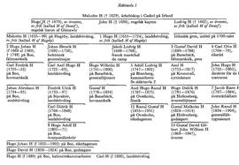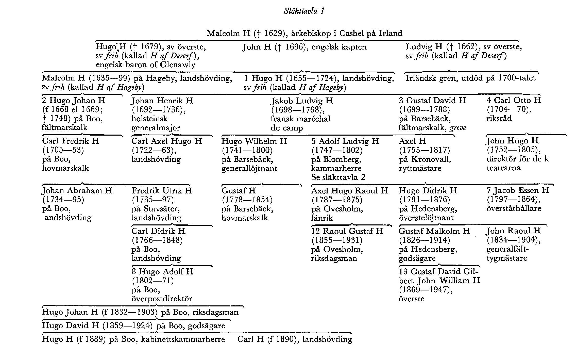 1 Malcolm H (1635–99) gick i sv tjänst 1654, utmärkte sig vid stormningen av Khvn 1659, deltog i L Kaggs infall i Norge 1659–60 o naturaliserades som sv adelsman 1664. Han blev överste för Älvsborgs regemente 1678, friherre jämte brodern Hugo 1689 o generalmajor o landshövding i Västernorrlands län 1698. Genom äktenskap med en dtr till den adlade gbgs-köpmannen Hans Makeléer kom han i besittning av säteriet Hageby i Svenneby (Skar), varför hans ättlingar kom att kallas H af Hageby. Hans son fältmarskalken Hugo Johan H (H 2) sålde Hageby 1738 o gjorde 1735 säteriet Boo i Bo (Ör) till fideikommiss för sina ättlingar.