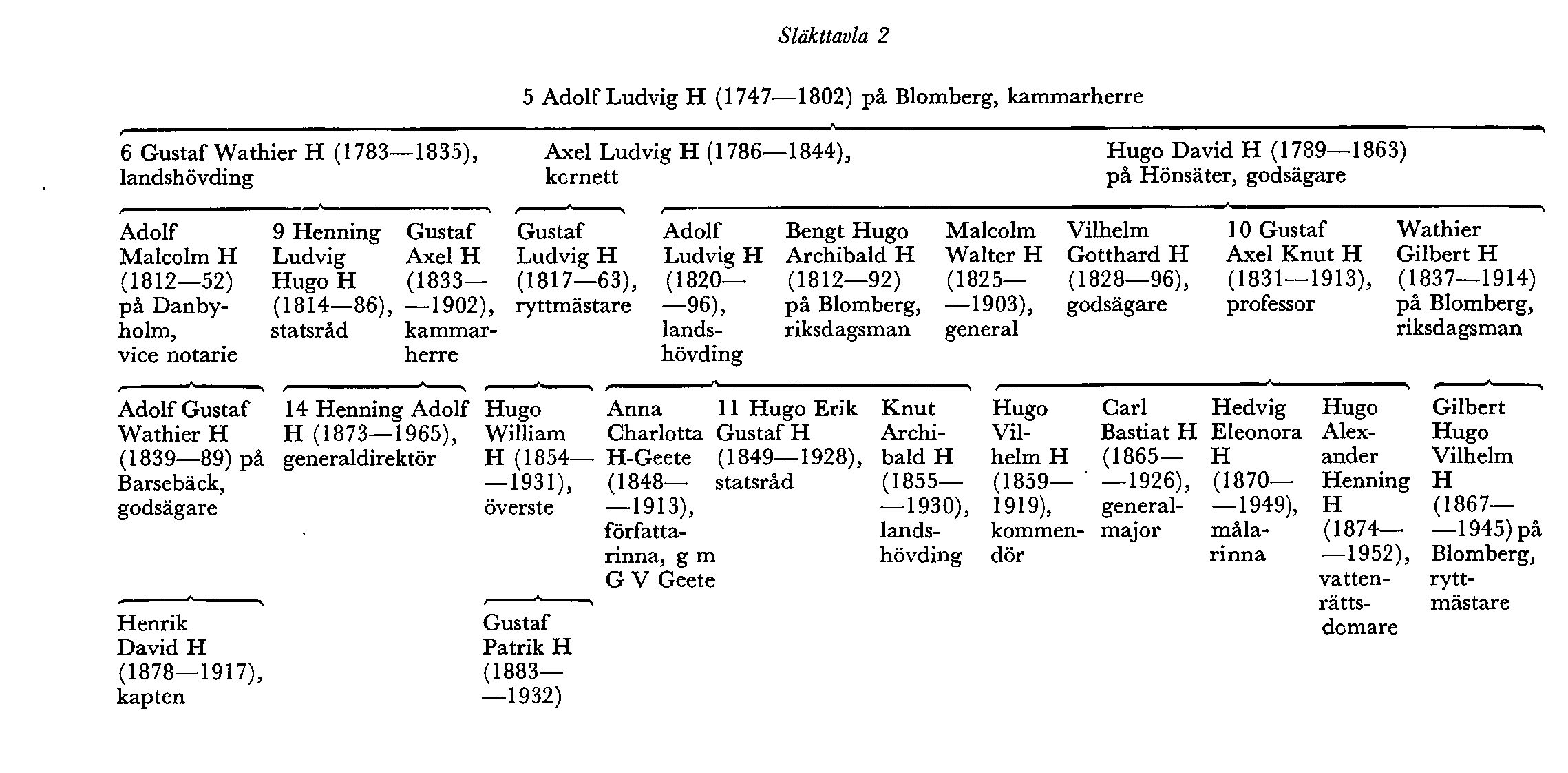 Adolfs, Hugos, Malcolms o Gilberts bror godsägare Vilhelm Gotthard H (1828–96) blev farfar till kommendör Percy H (f 1901), o deras bror professor Gustaf Axel Knut H (H 10) blev far till kommendören Hugo Vilhelm H (1859–1919), generalmajoren Carl Bastiat H (1865–1926), målarinnan Hedvig Eleonora H (1870–1949) o vattenrättsdomaren Hugo Alexander Henning H (1874–1952). Carl B H, som 1892–1902 var artilleristabsofficer, gjorde en betydelsefull insats för artilleriets ombeväpning och utrustning med modern materiel i samband med indelningsverkets avveckling. Han blev 1909 överstelöjtnant vid Göta artilleriregemente, 1913 överste o chef där, 1922 generalmajor o chef för sjätte arméfördelningen o 1926 för första arméfördelningen. 1912–14 var han riksdagsman i FK, deltog livligt i frågor rörande försvaret o tillhörde försvarsutskottet vid urtima riksdagen 1914. Son till Hugo A H är häradshövding Carl H (f 1915).