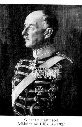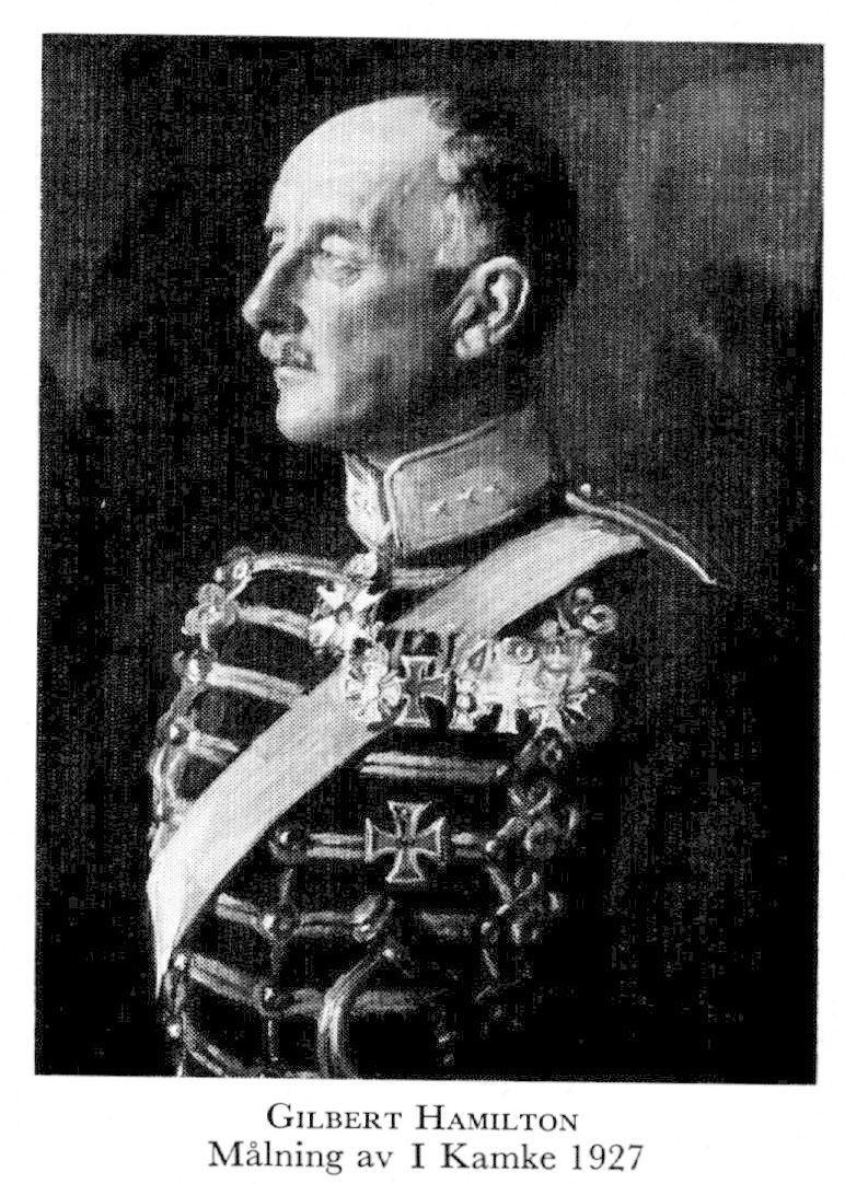 13 Hamilton, Gustaf David Gilbert John William, f 20 mars 1869 på Hedensberg, Tillberga (Vm), d 11 aug 1947 i Linköping. Föräldrar: godsägaren greve Gustaf Malkolm H o frih Sofia Lovisa Hedvig Mariana Barnekow. Mogenhetsex vid h a l i Strängnäs 19 maj 88, officersex vid krigsskolan på Karlberg 28 okt 91, underlöjtn vid Livgardet till häst 13 nov 91, löjtn 10 sept 97, ryttmästare 1 maj 08—27 okt 14, skvadronchef vid preussiska livkyrassiärreg Grosser Kurfurst 14, major där 27 jan 15, chef för 22:a reservjägardetachementet 11 okt 15, för preussiska kyrassiärreg Graf Wrangel, nr 3, 13 juni 18, avsked ur preussisk tjänst 19, överste o chef för Smålands husarreg 21 okt 21, överste på övergångsstat 20 maj 27, flygeladjutant hos fd kejsar Wilhelm II på Doorn, Holland, 28—40, generalmajor i tyska arméns reserv 25 aug 39. — LKrVA 31.