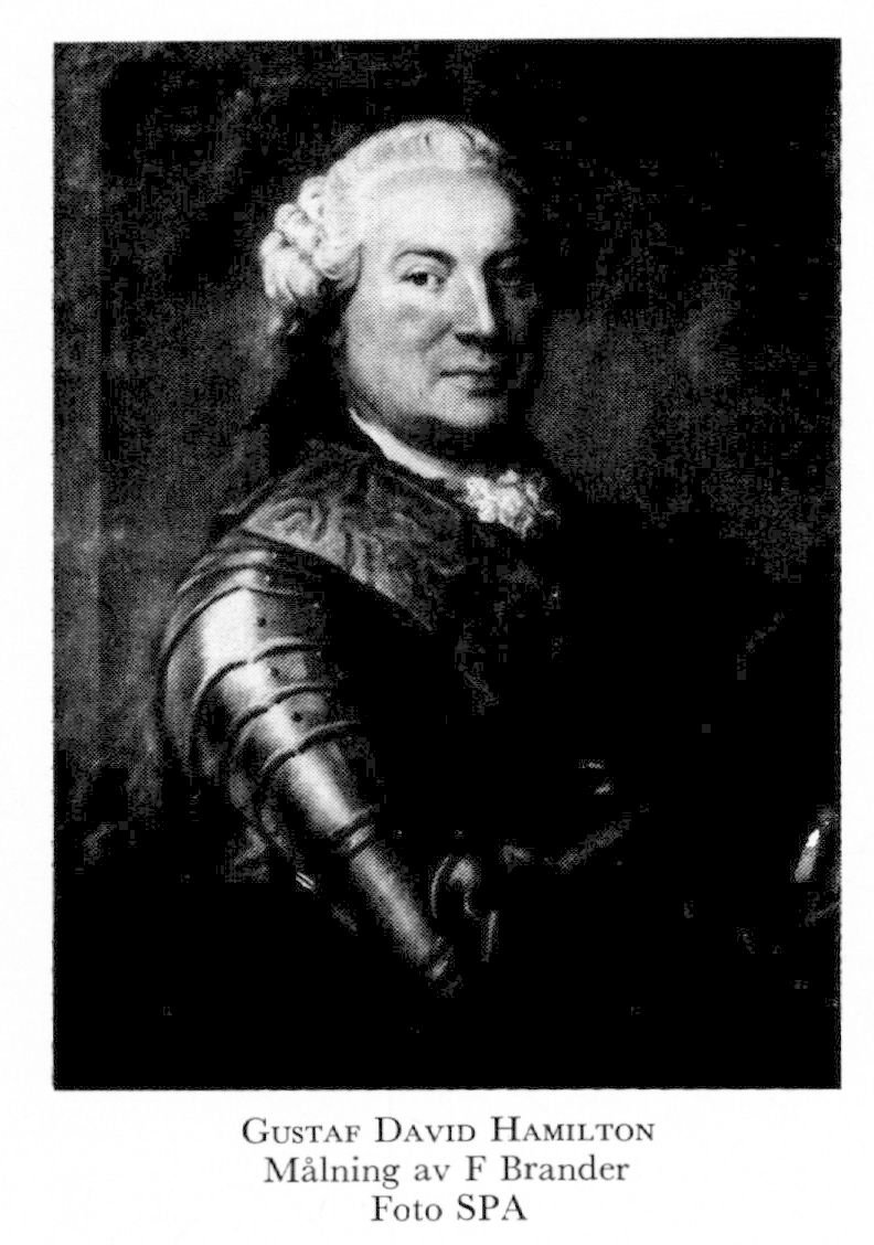 3 Hamilton, Gustaf David, son till H 1, f 29 jan 1699 på Forstena, V Tunhem (Älvsb), d 29 dec 1788 på Barsebäck, Barsebäck (Malm). Kornett vid Livdragonreg 9 jan 18, kapten vid reg Royal Suédois 15 mars 20, överstelöjtn i fransk tjänst 25 mars 40, överste för eget reg i sv tjänst 13 juli 41, generalmajor vid infanteriet 29 juni 47, greve 21 nov 51 (introd 52), generallöjtn 29 april 55, general 24 juli 58, general en chef i Pommern 28 juni—23 nov 58, fältmarskalks titel 18 dec 65, en av rikets herrar 17 dec 78. — RoKKMO 69.