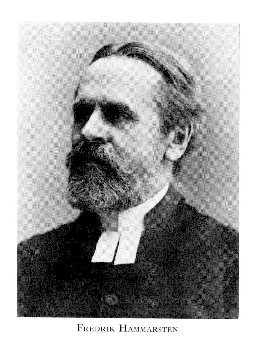 2 Hammarsten, Fredrik, bror till H 1, f 16 aug 1846 i Norrköping, d 11 jan 1922 i Sthlm (Jak). Inskr vid UU 3 febr 68, teol fil ex 24 mars 69, teor teol ex 31 jan 71, prakt teol ex 9 dec 71, prästv 12 jan 72, pastorsadjunkt i Västerlösa (Ög) 73, komminister i Hannäs (Kalm) 19 febr 75 (tilltr 1 maj 77), pastoralex 26 febr 81, komminister i Hedvigs förs i Norrköping 27 aug 83 (tilltr 1 maj 86), kh i Örtomta (Ög) 30 okt 91 (tilltr 1 maj 94), i Solna 19 okt 96 (tilltr 1 maj 98), dessutom slottspastor på Karlberg 23 okt 96 (tilltr 1 maj 98), eo k hovpredikant 30 sept 98, led av styr för Evangeliska fosterlandsstiftelsen från 99, pastor vid Blasieholmskyrkan i Sthlm 16 juni 99, kh i Jakobs förs där 18 jan 08 (tilltr 1 febr 08), led av styr för Sv bibelsällsk från 08, av kyrkomötena 09 o 10, av dir för Sthlms stads undervisn:verk 14—16. — Teol hed:dr vid UU 31 maj 21.