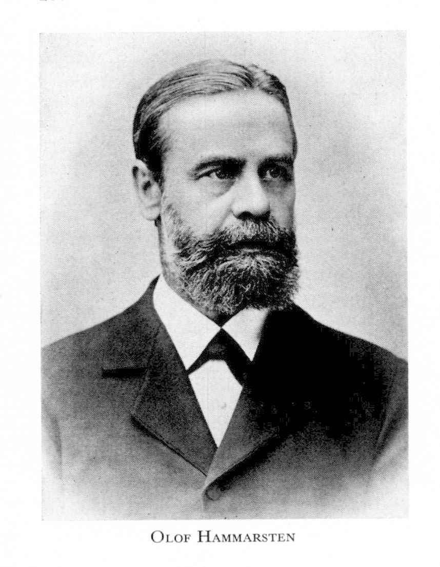 1 Hammarsten, Olof, f 21 aug 1841 i Norrköping, d 21 sept 1932 i Uppsala. Föräldrar: varvsägaren Per Wilhelm H o Ulrika Fredrika Palm. Genomgick Norrköpings lyceum, studentex vid UU 22 maj 61, med fil ex 15 dec 62, MK 29 maj 66, ML 6 mars 69, disp pro gradu 22 maj 69, MD 1 juni 69, doc i fysiologi 21 juni 69, adjunkt i medicinsk o fysiologisk kemi 24 jan 73, personl eo professur i medicin 1 juni 77, prof i medicinsk o fysiologisk kemi 16 nov 83—7 sept 06, led av drätselnämnden 1 juni 86—31 maj 05, allt vid UU, ordf i Uppsala läkarefören ht 86—vt 06, i styr för Sätra brunn 86—7 jan 02, led av stadsfullm i Uppsala 87—03 (ordf okt 00—02), prorektor vid UU 1 juni 93—31 maj 01, rektor där 1 juni 01—31 maj 05, led av Uppsala läns landsting 02—11. — LVS 78, LVA 81 (led av Nobelkommittén för kemi 05—26, ordf där från 10), fil hedersdr vid UU 6 sept 93, LVVS 95, LFS 00, Sv läkaresällsk:s Berzelius-medalj 01, HedLVVS 07, med hedersdr i Kristiania 11, HedLVS 16, UU:s Gustaf Adolfs-medalj 26.