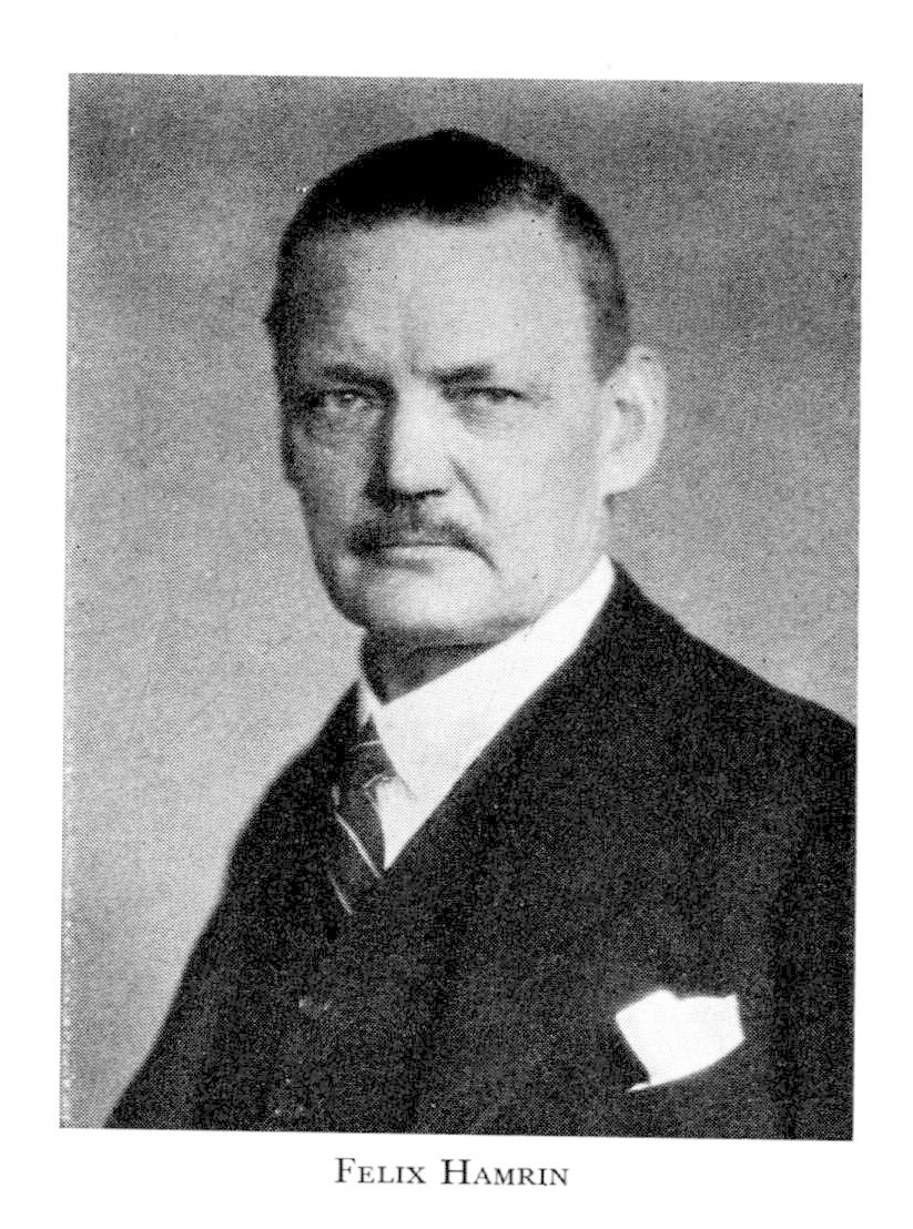 1 Hamrin, Felix Teodor, f 14 jan 1875 i Mönsterås (Kalm), d 27 nov 1937 i Jönköping. Föräldrar: läderhandl Carl Gustaf Petersson H o Maria Lovisa Cedergren. Elev vid lärov i Eksjö, skeppsgossekåren i Karlskrona o handelsskola i Gbg, drev egen grossiströrelse i livsmedelsbranschen, ab Felix Hamrin & Co, i Jönköping 03—30 (med undantag för anställn i Gbg 15—17), led av AK 12—14, 18—33 o av FK från 34 (led av bankoutsk 23—26, statsrevisor 24— 26, led av talmanskonferensen o utrikesnämnden från 33, ordf i särsk utsk 33, v ordf i statsutsk 34, fullm i riksbanken 34), led av 1914 års tullkommission juli 18— sept 19, led av Liberala samlingspartiets förtroenderåd 20, av Fris folkpartiets förtr: råd 24, statsråd o chef för handelsdep 7 juni 26—2 okt 28, statsråd o chef för finansdep 7 juni 30—24 sept 32, statsminister 6 aug—24 sept 32, partiledare för Frisinnade folkpartiet 33, ordf i Folkpartiets förtroenderåd 34—36, Folkpartiets gruppledare i FK från 34, landsh i Jönköpings län från 30 nov 34.