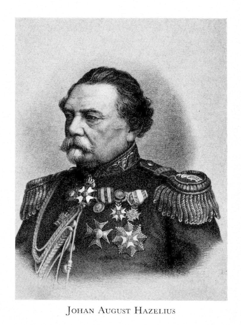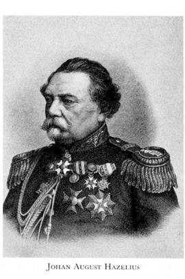 1 Hazelius, Johan August, f 18 april 1797 i Sthlm (Jak), d 28 april 1871 där (Klara). Föräldrar: lärftskramhandlaren Johan H o Lovisa Dorotea Keijser. Kadett vid Karlberg 28 sept 10, underlöjtn vid ingenjörkårens fältmätningsbrigad 17 maj 14, deltog i kriget i Norge sommaren 14, löjtn:ex vid ingenjörkåren 5 febr 17, löjtn där 18 april 21, kapten där 3 juli 29, lär i taktik o strategi vid ingenjörkårens lärov 2 dec 29, lär i taktik, strategi o krigshist vid h artillerilärov på Marieberg 1 mars 30—13 sept 58, ordonnansofficer hos kronprinsen 16 febr 30, förest för egen läroanst för linjeofficerare 31 —57, major i armén 4 juli 36, kapten vid topografiska kåren 31 jan 43, överstelöjtn i armén 6 febr 43, major vid topografiska kåren 28 nov 45, adjutant hos konungen 27 sept 45—3 okt 50, led av kommittén för utarb av nytt exercisreglemente 23 nov 45, medlem i Nya elementarskolans direktion 21 jan 46 (ordf där 62—71), överstelöjtn i topografiska kåren 15 april 48, överste i armén 26 okt 50, ägare av Sv tidningen 1 dec 51—nov 59 (red o ansvarig utg 51—56), chef för topografiska kåren 12 dec 56, led av lantförsvarskommittén 61, generalmajor 2 maj 62, led av stadsfullm i Sthlm 63—71, led av FK 68—71. — LKrVA 23 (sekr där 44—68).