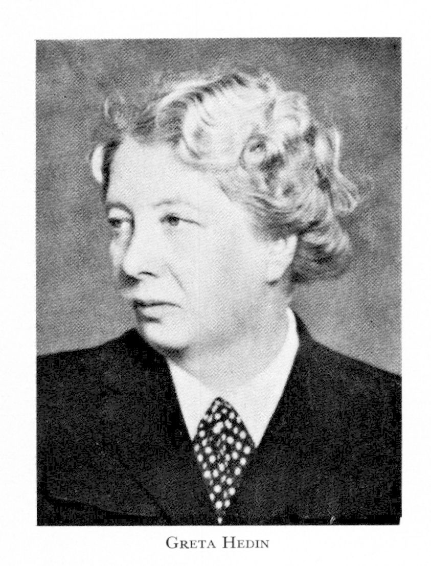 2 Hedin, Greta, brorsdtr till H 1, f 21 mars 1889 i Gbg (Kristine), d 14 juni 1949 i Gbg (Vasa). Föräldrar: postmästaren Anders Peter H o Emelie Jacobsen. Mogenhetsex vid Sigrid Rudebecks skola i Gbg 12 juni 08, inskr vid UU ht 08, FM där 16 sept 12, inskr vid Gbgs högsk ht 12, lär vid Sigrid Rudebecks skola 12—35, vid Gbgs kvinnl folkskolesem 13—15 o ht 17, FL vid Gbgs högsk 30 jan 26, disp pro gradu 29 maj 28, FD 6 okt 28, doc i litt:hist med poetik 14 nov 29, studierektor vid Sigrid Rudebecks skola o föreståndare vid Gbgs gymn för flickor 30—35, lektor i modersm o hist vid h a l för flickor i Gbg 24 febr 33, ordf i Akad bild kvinnors fören, västra kretsen, från 33, ordf i fören Frisinnade kvinnor i Gbg 34—45, v ordf i FP i Gbg 37—48, v ordf i Akad bild kvinnors fören 42, ordf där 48. — LVVS 43. — Ogift.