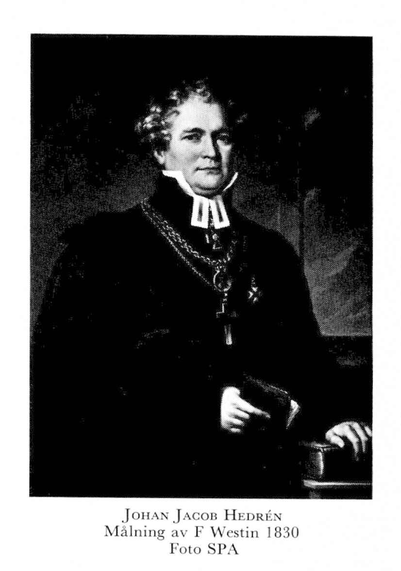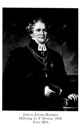 1 Hedrén, Johan Jacob, f 4 mars 1775 i Rännelanda (Älvsb), d 14 febr 1861 i Linköping. Föräldrar: prosten Anders H o Brita Christina Vermelin. Inskr vid UU 1 mars 93, mag där 13 juni 97, doc i praktisk ekonomi 30 nov 97, adjunkt i samma ämne 17 nov 02, avlade präst- och pastoralex i Karlstad 9 juni 03, prästv i Sthlm 30 juni 03, pastorsadjunkt i Jakobs o Johannes förs:ar 1 nov 03—maj 06, notarie i hovkonsist 12 maj 05—30 april 09, reg:pastor vid Svea livg 20 febr 07, k hovpredikant 20 maj 07, led i hovkonsist 22 juni 07, predikant vid Borgerskapets änkehus 15 nov 08, TD 7 okt 09, kh i Jakobs o Johannes förs:ar i Sthlm 10 maj 10, assessor i Sthlms konsist 29 maj 10, riksdagsman 12—48, fullm i riksgäldskontoret 11—30, tjänsteförrättande överhovpredikant dec 13, led av evangeliebokskomm 15, ordf i komm för överseende o granskning av kyrkolagen 24, biskop i Karlstad 24 juli 29, biskop i Linköping 21 dec 33, v talman i prästeståndet riksdagarna 40— 41, 44—45, 47—48, jubelmag 48. — LLA 12, LKrVA 15, LMA 41.