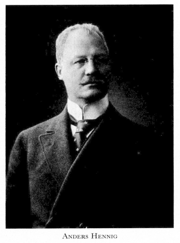 Hennig, Anders Henning, f 22 maj 1864 i Jönköping, d 19 april 1918 i Sthlm (Osc). Föräldrar: handl Gustaf Magnus Andersson o Anna Maria Johannisdtr. Mogenhetsex vid h a l i Jönköping 29 maj 83, inskr vid LU 14 sept 83, FK där 29 maj 86, amanuens vid geol institutionen 28 maj 89— 31 dec 00, tjänstgj som e geolog vid Sveriges geol undersökn somrarna 89—90, 92, 93 och 00, FL 20 nov 91, disp pro gradu 21 maj 92, FD 31 maj 92, docent i geologi 2 juni 92, allt vid LU, studier i mineralogi o petrografi under ledn av prof Cohen i Greifswald somrarna 94 o 95, studier i samma ämnen under ledn av prof Becke i Prag 97, genomgick provårskurs vid h a l i Lund 01, lär vid tekn elementarskolan i Malmö 03—05, lektor vid h a l i Lund 22 dec 05, assistent vid geolmineralogiska institutionen 05—06, docent i geologi o hydrografi 13 okt 07, prof:s n h o v 24 nov 11, tf lärov:råd 7 dec 12, lärov:råd 26 nov 14, ordf i Geol fören i Sthlm 16. — Vetenskapliga studieresor för att studera flod- och glaciärerosion samt Inns hydrografi bl a till Graubünden i Österrike 07 o 10—12. — LFS 00.