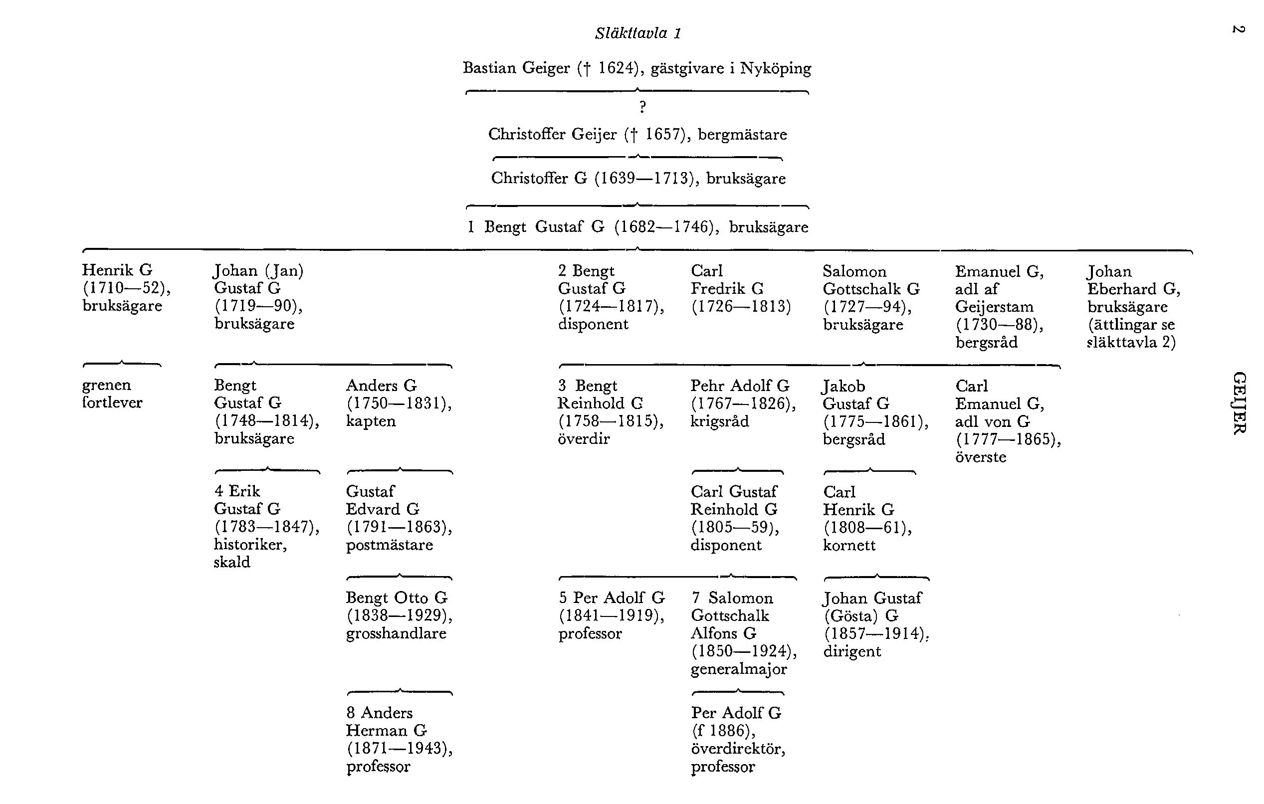 Stamfar för släktens ännu fortlevande grenar blev den sistnämnde Christoffer G:s bror, ägaren till Uddeholms bruk Bengt Gustaf G d ä (G 1). Han blev far till 13 barn, bl a disponenten Bengt Gustaf G d y (G 2), bergsrådet Emanuel G (1730–88), som adlades 1773 med namnet af Geijerstam (se art o släktart nedan) o den originelle Carl Fredrik G (1726–1813), gårdsfogde på Uddeholm, känd som »patron Carl». I sina bevarade dagböcker, som lämnat stoff till Lotten Dahlgrens bok 1916, har denne givit rikliga bidrag till kunskapen om den värmländska släkt- o bruksmiljön. Han gjorde donationer bl a till avlöning av en bruksläkare, till UU o till Karlstads läroverk. Besjungen och tecknad av Erik Gustaf G, har han sitt intresse främst som avvikande typ i bruksmiljön. Fyra av hans bröder blev stamfäder för var sin ännu kvarlevande släktgren (A–D).