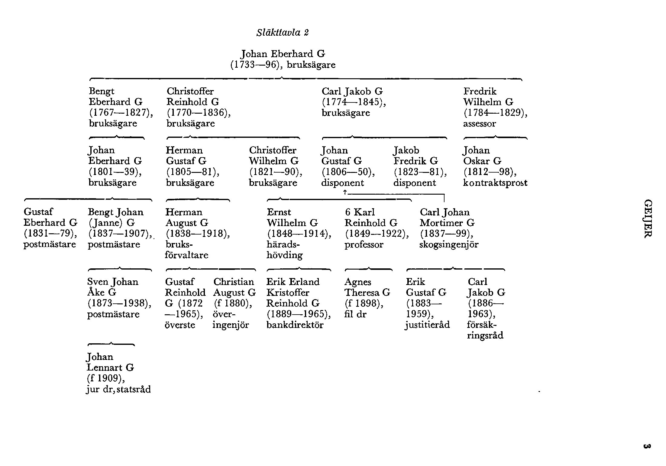 Ytterligare en bror till G 3, bergsrådet Jacob Gustaf G (1775–1861) efterträdde 1804(–30) sin farbror G 2 som disponent för Uddeholmsbolaget. Han blev farfar till tonsättaren o dirigenten Johan Gustaf (Gösta) G (1857–1914).