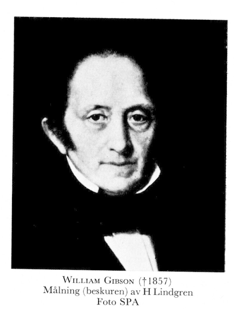 1 Gibson, William, f 11 mars 1783 i Arbroath, Skottland, d 3 aug 1857 i Gbg (Domk). Föräldrar: segelduksfabrikören William G o Isabel Neish. Kom till Gbg 97, invald i handelssoc där 29 aug 06 (styr:led 18–28), i bryggaregillet 5 dec 06, burskap som handlande 08, styr:led i Gbgs sparbank 26–30, led av dir för Gbgs fattigförsörjn:inrättn 37–39 o av fabriksfullm 47–50. Grosshandlare, redare, industriidkare.