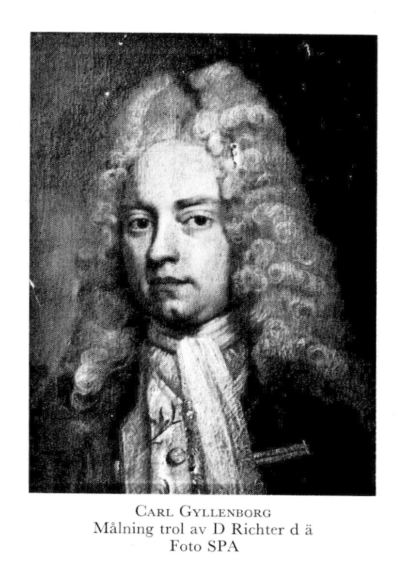 2 Gyllenborg, Carl, son till G 1, f 7, dp 9 mars 1679 i Sthlm (Nik), d 9 dec 1746 där (ibid), begr 8 mars 1747 i Uppsala. Inskr vid UU 25 sept 86, rector illustris 16 juni 98–17 juni 99, sekr (»adjutant») hos olika chefer vid armén 01–03, legationssekr vid sv beskickningen i London 23 nov 03, resident där enl interimsförordn 21 maj 10, k konfirm 12 nov 10, eo envoyé där 16 maj 15, statssekr vid handelsexp 14 jan 18, ministre plénipotentiaire vid fredskongressen på Åland 7 febr 18, v hovkansler 9 juni 19, hovkansler (jämte G Wachschlager) 24 maj 20, fullm å denna tjänst (efter Wachschlagers död) 3 jan 21, riksråd 12 aug 23, kansler för LU 21 okt 28, kanslipresident 16 april 39, kansler för UU 15 maj 39.