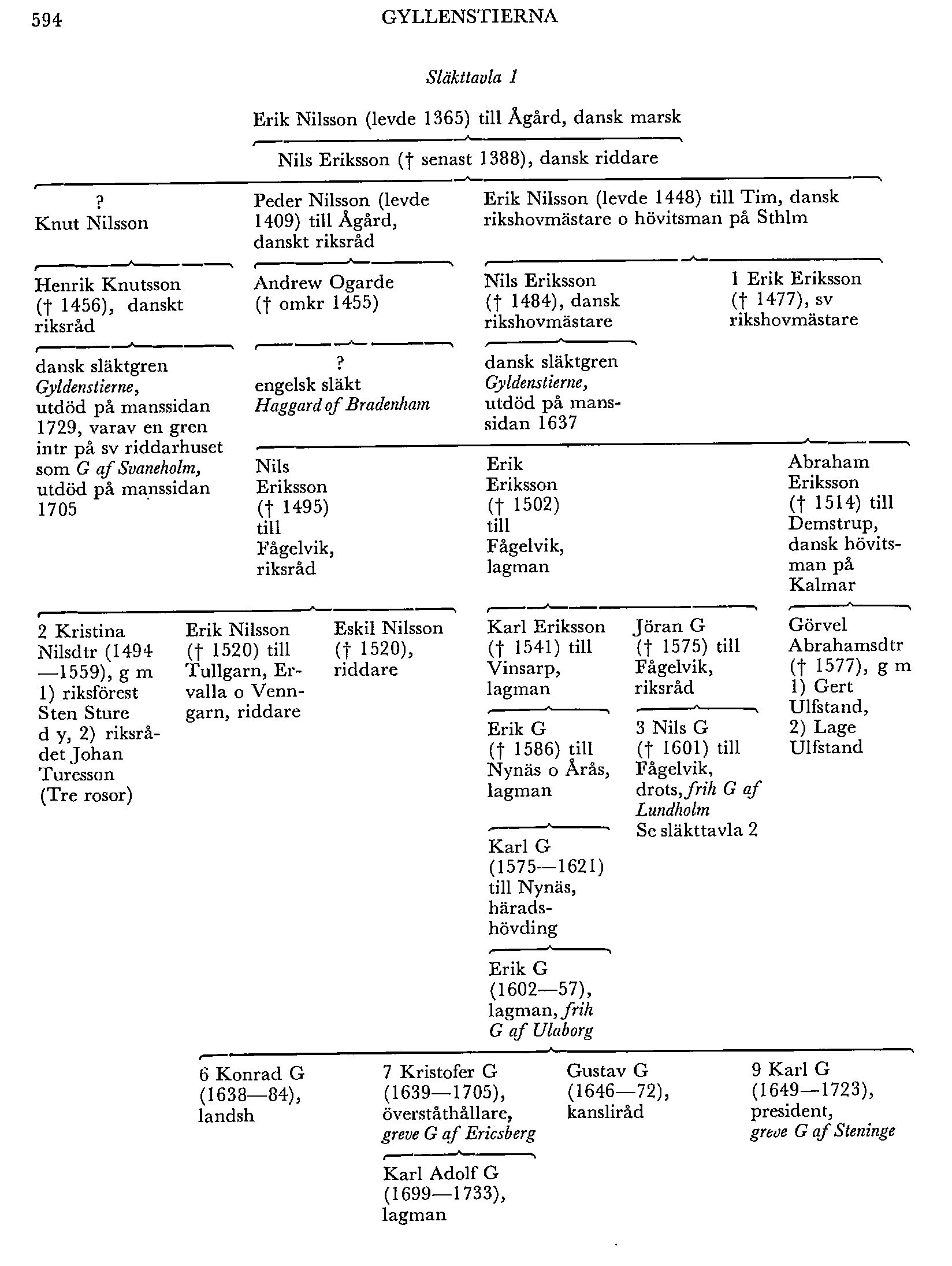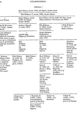 Erik Nilssons son Nils Eriksson (d 1484) till Tim nämnes som Kristian I:s hovmästare 1453—56 o kammarmästare 1466—69 samt förekommer bland dennes representanter vid åtskilliga uppgörelser med svenskarna 1449—76. Ett stort antal brev från kungen till honom finns i DRA (tr i Missiver), o vissa av dem har intresse även för tidens sv historia. Nils Eriksson blev stamfar för en släktgren, som från 1500-talet kallade sig Gyldenstierne o utdog på manssidan 1637. Hans bror Erik Eriksson (G 1) kom i samband med sitt äktenskap med en av konung Karl Knutssons döttrar att bosätta sig i Sverige.
