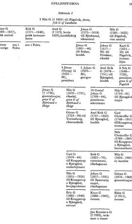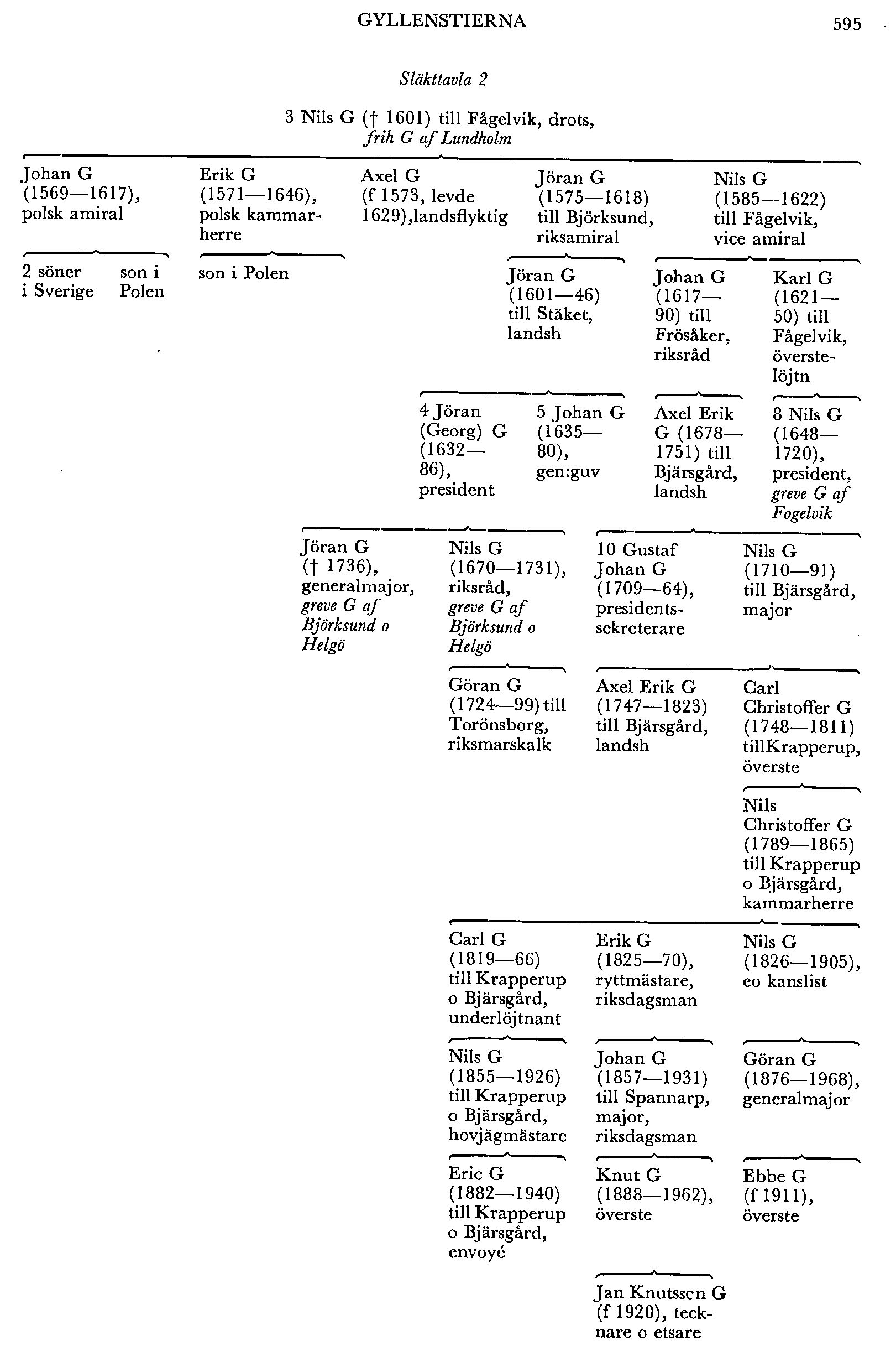 B Vice amiralen Nils G (1585—1622) till Fågelvik blev far till Johan G (1617— 90) på Frösåker i Kärrbo (Vm), som var vice president i Svea hovrätt 1647—50, landshövding i Östergötland 1650—54, riksråd 1654—73 o president i Svea hovrätt 1668—73. I skånska kommissionen 1669—70 utförde han tillsammans med Clas Rålamb ett ihärdigt o samvetsgrant arbete. G var känd för sin lärdom o har bl a efterlämnat avskrifter ur danska släktböcker o för medeltidsforskningen värdefulla excerpter (se Gillingstams PM). Hans brorson presidenten Nils G (G 8) blev greve 1706 o introducerades 1719 med namnet G af Fogelvik men dog utan att efterlämna söner. Hans enda efterlevande dtr var gift med kanslipresidenten Arvid Horn, som därigenom kom i besittning av Fågelvik.