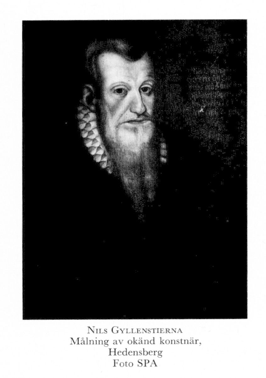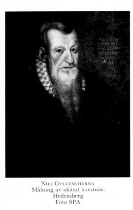 3 Gyllenstierna, Nils, sonsons son till G 1, f 1526 (Peringskiöld, RHA), d i okt 1601 (A Brahes tidebok) på Fågelvik i Tryserum (Kalm). Föräldrar: riksrådet Jöran G o Kerstin Nilsdtr (Grip). Inskr vid univ i Wittenberg juni 42, anställd vid hertig Eriks kansli 18 febr 60, riksråd o kansler i samb med tronskiftet hösten 60, riddare vid Erik XIV:s kröning i Uppsala 29 juni 61, sv sändebud till olika utländska hov 60—66, inskr vid univ i Rostock sept 63, lagman i Tiohärads lagsaga 68, ledare för Johans kansli från okt 68, deltog i fredsförhandl:arna med Danmark juli—aug 69, frih vid Johan III:s kröning 10 juli 69, erhöll friherrskap 4 juni 70, ledare för fredslegationen till Stettin 70, överste befallningsman över allt Småland 5 mars 77, häradsh i Handbörd (Kalm) från 78, i Ärlinghundra (Sth) 83, landshövd över allt Småland 12 aug 89, kallas drots från juli 90, bekräftelse på sina förläningar 18 sept 90 o 12 juli 94 (bl a 7 socknar i Tjust), Sigismunds stadfästelse på friherrskapet 1 april 94.