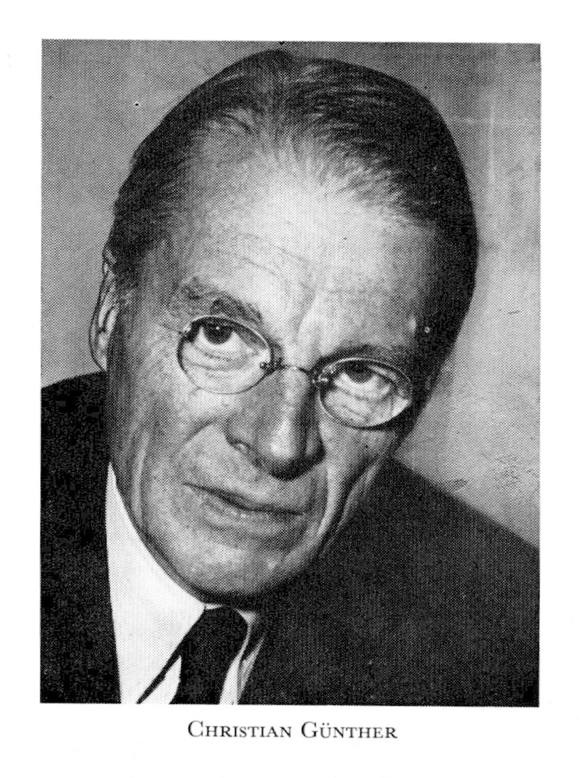 2 Günther, Christian Ernst, sonson till G 1, f 5 dec 1886 i Sthlm (Hedv El), d 6 mars 1966 där (Osc). Föräldrar: envoyén Ernst Axel G o Anna Georgina Boltenhagen. Mogenhetsex vid Nya Elementarskolan i Sthlm 16 maj 04, inskr vid UU ht 04, studier där ht 04—vt 08, inskr vid LU vt 09, FK där 15 sept 09, JK där 31 maj 16, anställd vid folkhushålln: kommissionen 16—18, notarie i lantbruksstyr 6 dec 18, sekr i tull- o traktatkommittén 29 juni 21—5 juni 24, tf förste kanslisekr i handelsdep o chef för dess traktatbyrå 22—25, sekr vid handelsavtalsförhandl:arna med Ryssland 22 o 23—24, handsekr hos statsministern 24—25, sekr vid handelsavtalsförhandl:arna med Tjeckoslovakien o Siam 25, tf chef för UD:s speciella handelsavd 16 okt 25, sekr vid handelsavtalsförhandl: arna med Tyska riket 26, ombud vid dito med Turkiet 26, sv sakkunnig vid ekonomiska världskonferensen i Geneve 27, chef för UD:s handelsavd 24 maj 28, bitr delegerad vid handelsavtalsförhandl: arna med Tyska riket 29—30, utrikesråd 21 febr 30, envoyé i Buenos Aires, Santiago de Chile, Montevideo o Asuncion 23 jan 31, ordf i exportkreditnämnden 33, kabinettssekr 30 nov 34, utrikesnämndens sekr 35—37, ordf i kommittén ang utredn av revision av bestämmelserna om utlänningars rätt att vistas i Sverige 36, envoyé i Oslo 26 nov 37, utrikesminister i samlingsregeringen 13 dec 39— 31 juli 45, envoyé i Rom 28 juni 46—21 april 50. — Ordf i styr för ab Turitz & Co 50—58, i Sv travsportens centralförb från 52, Sällskapet 52-—61, i Granit o betong ab från 54, led av styr för Sv ab Philips 1950—61 (ordf 60—61). — RoKKMO 6 juni 42.