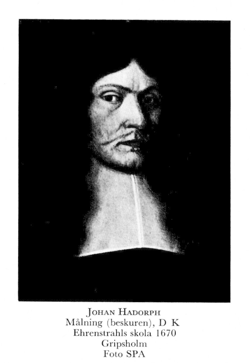 Hadorph, Johan, f 6 maj 1630 på Haddorp, Slaka (Ög), d 12 juli 1693 i Sthlm (jordf 17 sept, Jak; begr i Slaka). Föräldrar: kronofogden Nils Jönsson o Anna Hansdtr. Inskr vid UU 24 mars 41, inskr vid Linköpings trivialskola 25 mars 42 o vid gymnasiet, åter student i Uppsala mars 48, innehade k stip 26 maj 52—60, akademisekr i Uppsala 15 aug 60—1 april 76, k brev på 300 dlr smt för antikvitetsstudier 18 okt 65, rikskanslerns brev på fritt tillträde till RA 13 nov 65, uppbar 300 dlr smt av antikvarielönen på RA:s stat från 27 nov 66 o hela antikvarielönen från 24 nov 79, assessor i antikvitetskoll i Uppsala 17 dec 66—92, arkivsekns fullm 24 mars 69 (med rang som prof enl univ:kanslerns resolution 69), häradsh i Hanekinds hd (Ög) 18 april 72— 80, arkivsekr med lön o tjänstgöring vid antikviteterna 19 april 76, sekr o antikvarie vid antikvitetsarkivet enl k brev 23 april 92. Säterifrihet på Haddorp 15 maj 71 o 10 dec 74 samt frälsefrihet o adl privilegier för sig, sin hustru, sina barn o bröstarvingar 31 okt 72, vilket allt bekräftades genom k brev 14 maj 81.