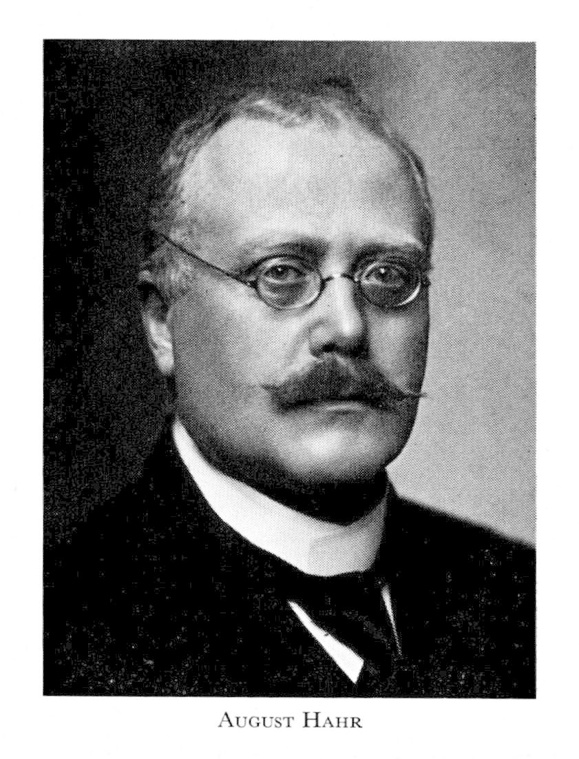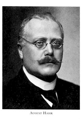 1 Hahr, August, f 29 okt 1868 i Dingtuna (Vm), d 21 maj 1947 i Gävle. Föräldrar: länsagronomen direktör Adolf Robert August H o Ragnhild Hilma Theresia Ljung. Mogenhetsex vid Västerås h a l 18 maj 88, inskr vid UU 21 sept 88, jur fil ex 13 sept 89, FL 29 maj 97, disp 27 maj 98, FD 31 maj 98, allt vid UU, sekr i SAK 98–99, lär bl a vid Tekn skolan i Sthlm 98–02, konstkritiker i Aftonbladet 99–02, doc i konsthist vid UU 31 dec 00–24 mars 09, bitr lär i estetik samt litt- o konsthist vid LU 1 jan 08–31 dec 13, doc i konsthist med konstteori där 24 mars 09–31 dec 14, bitr lär i estetik samt litt- o konsthist vid UU 1 jan 14–31 dec 17, ånyo doc i konsthist med konstteori vid UU 1 jan 15, prof i samma ämne 31 dec 17–30 okt 33. — LHVU 19, LVSL 21.