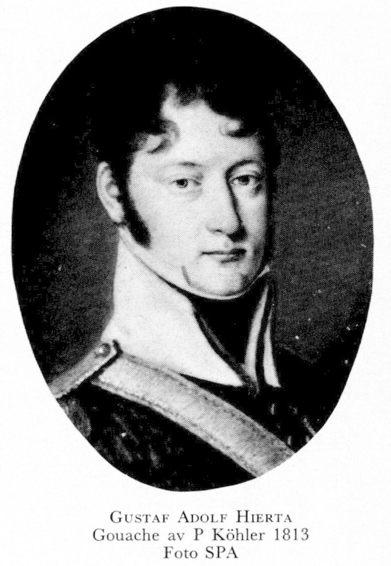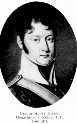 2 Hierta, Gustaf Adolf, f 20 april 1781 i Jumkil, Upps, d 15 mars 1847 i Uppsala. Föräldrar: överstelöjtn Lars Philip H o Wilhelmina Troil. Volontär vid Livreg:sbrigadens kyrassiärkår 2 aug 97, korpral 98, kornett 27 aug 98, premiäradjutant med kvartermästares indeln 20 nov 98, kornett på stat vid Roslags kompani 31 jan 01, löjtn där 19 febr 08, ryttmästare i kåren 29 juni 09, adjutant hos kronprinsen 4 nov 10, major vid kåren 23 mars 13, överstelöjtn i armén 1 mars 14, överste i armén 11 maj 18, generaladjutant 14 mars 24, överste o sekundchef för Livreg:s dragonkår 18 april 26, generalmajor i armén 24 juni 27, tf chef för stuteriöverstyr 2 april 28, frih 28 jan 32 enl RF § 37, generallöjtn i armén 6 febr 43, generalbefälhavare för tredje militärdistr 11 juni 45. — HedLKrVA 27, LLA 41.